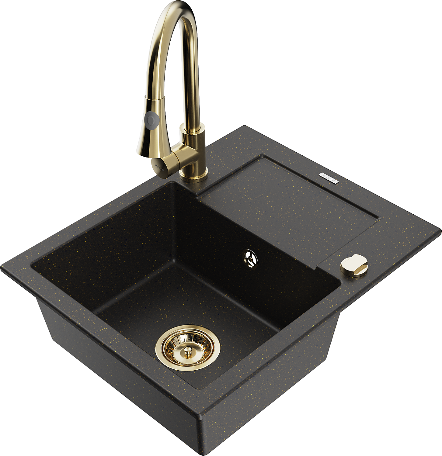 Mexen Enzo 1-bowl granite sink with drainer and Elia kitchen tap, black/gold metallic - 6506-75-670101-50