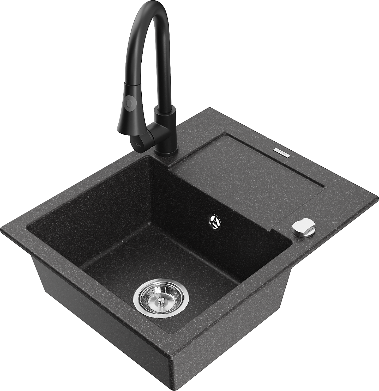 Mexen Enzo 1-bowl granite sink with drainer and Elia kitchen tap, black speckled - 6506-76-670101-70