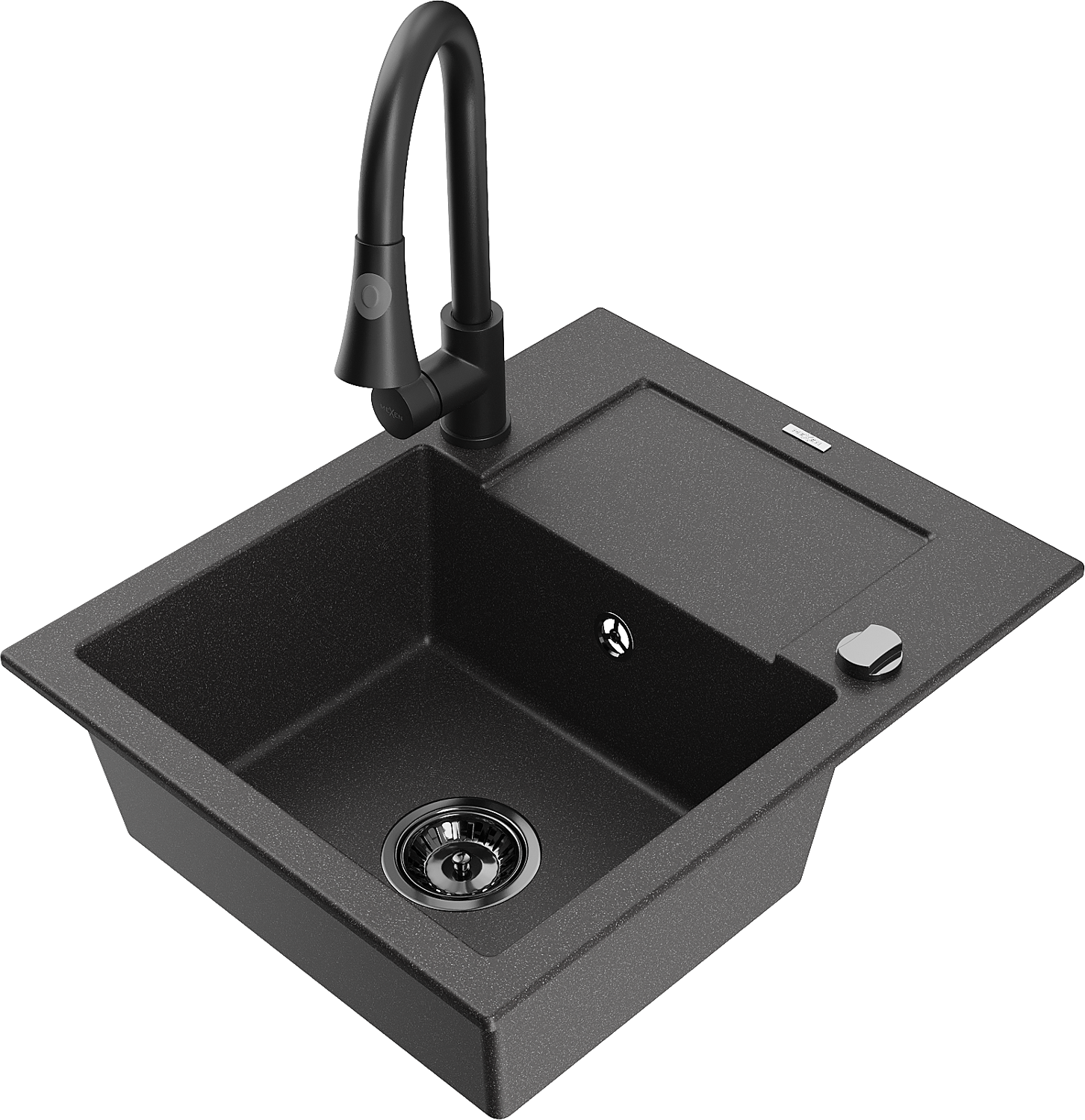 Mexen Enzo granite sink 1-bowl with drainer and Elia kitchen tap, black speckled - 6506-76-670101-70-B