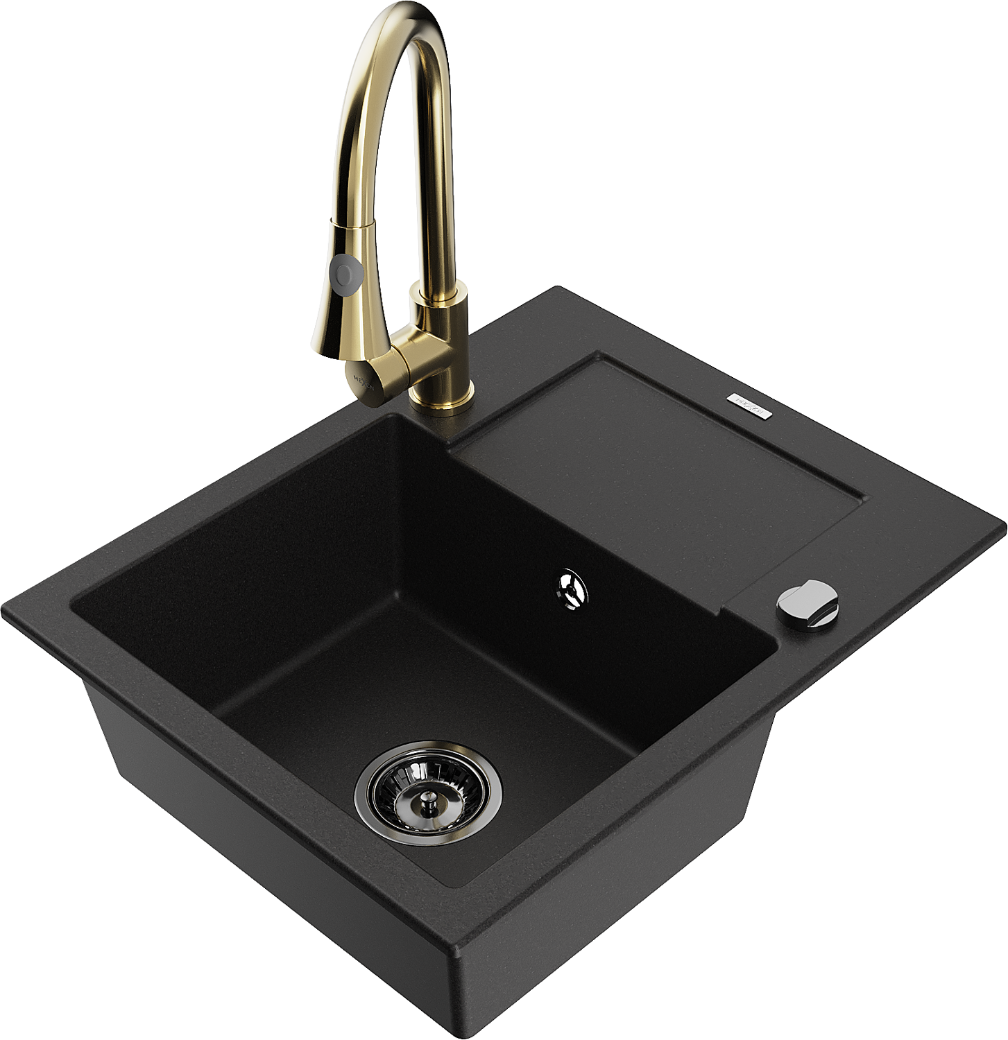 Mexen Enzo granite kitchen sink single-bowl with drainer and Elia kitchen tap, black - 6506-77-670101-50-B