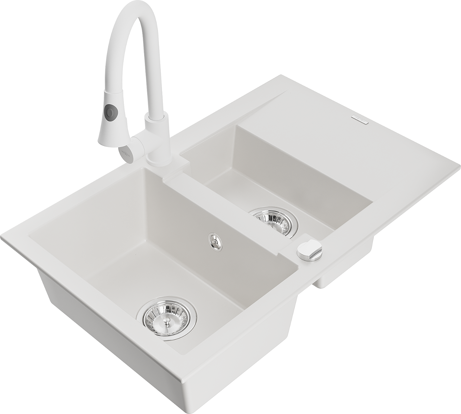 Mexen Gaspar granite sink 1.5-bowl with drainer and Elia kitchen tap, white - 6507-20-670101-20