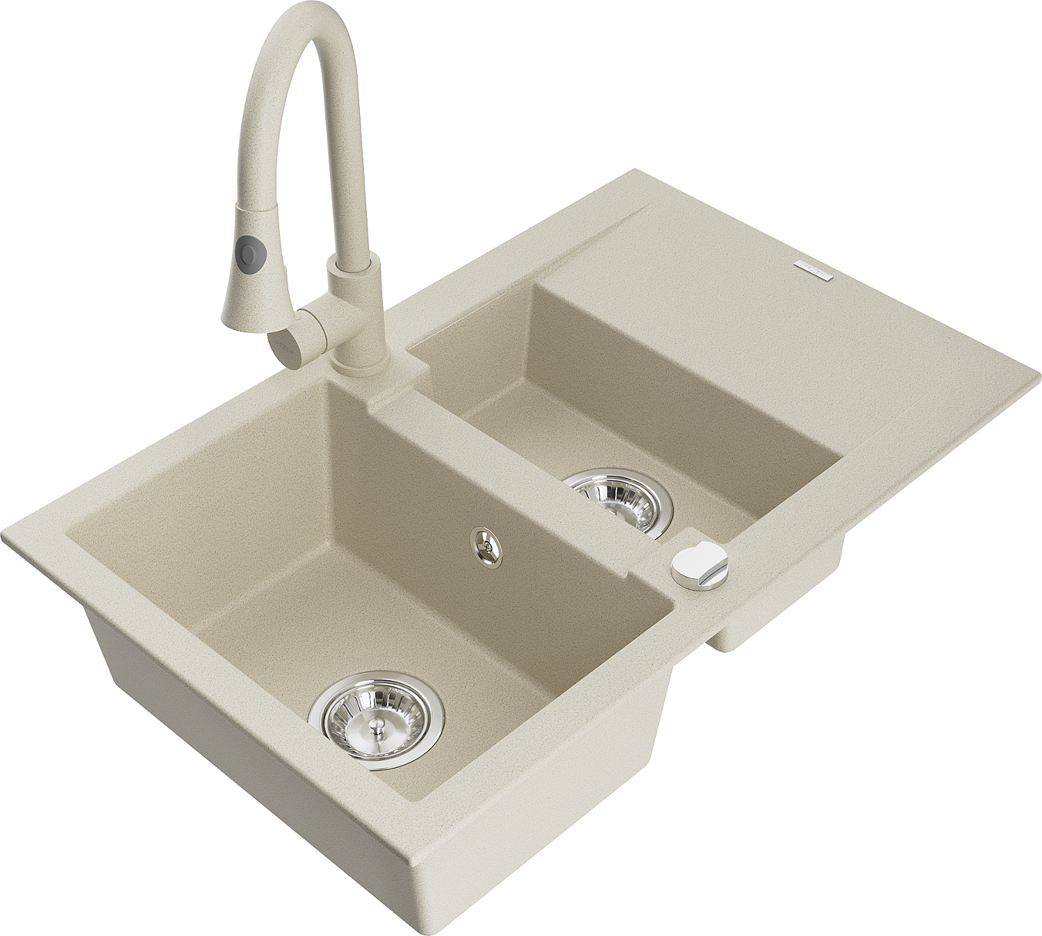 Mexen Gaspar granite sink 1.5-bowl with drainer and Elia kitchen tap, beige - 6507-69-670101-69