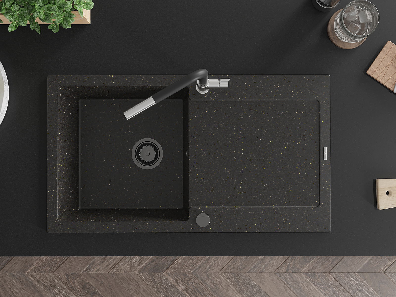 Mexen Leo granite kitchen sink with 1 basin, drainer and Flora kitchen tap, black/gold metallic - 6501-75-670401-07-B
