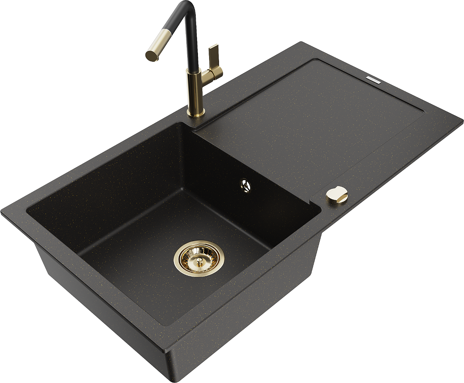 Mexen Leo 1-bowl granite sink with drainer and Flora kitchen tap, black/gold metallic - 6501-75-670401-57-G