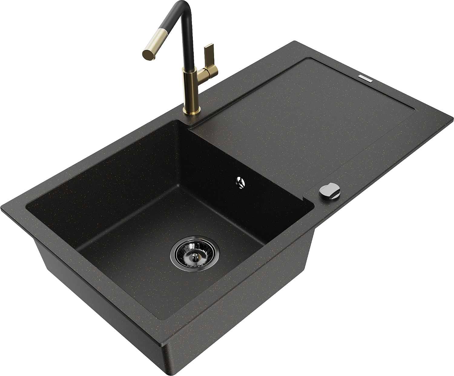 Mexen Leo 1-bowl granite sink with drainer and Flora kitchen tap, black/gold metallic - 6501-75-670401-57-B