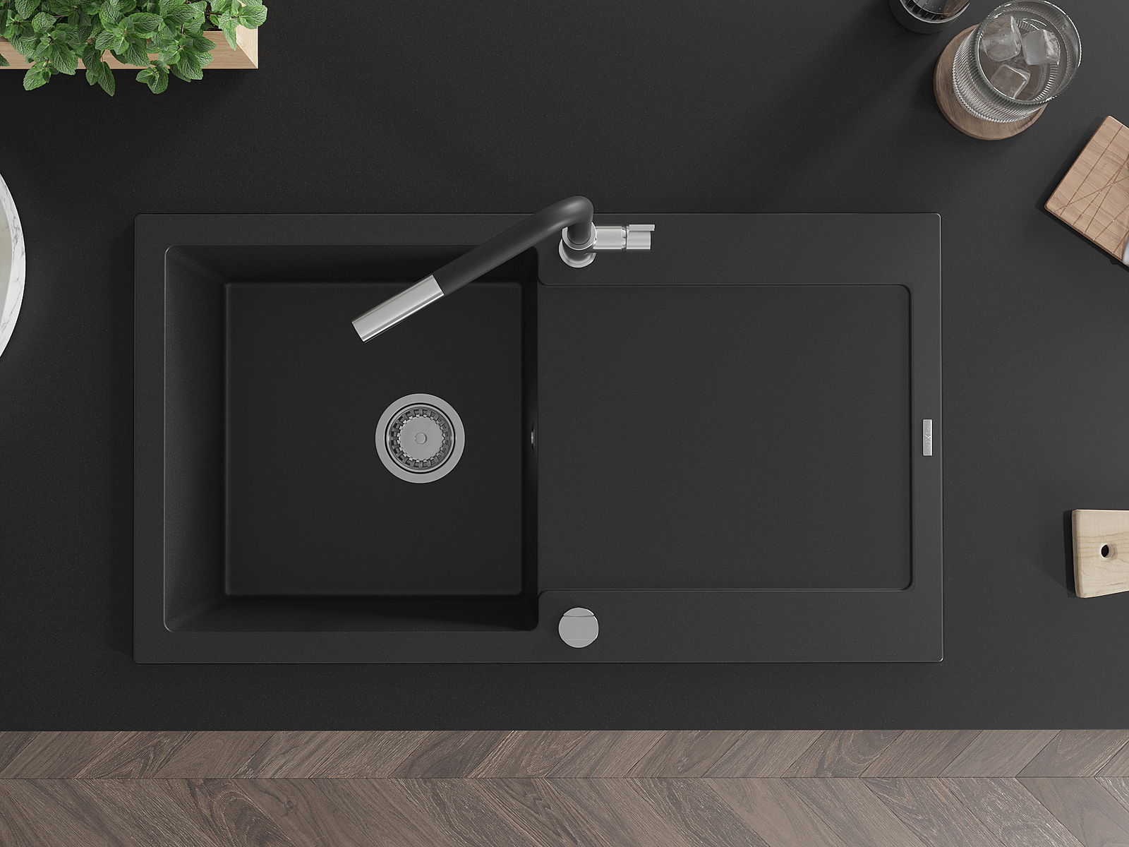 Mexen Leo 1-bowl granite sink with drainer and Flora kitchen tap, black - 6501-77-670401-07
