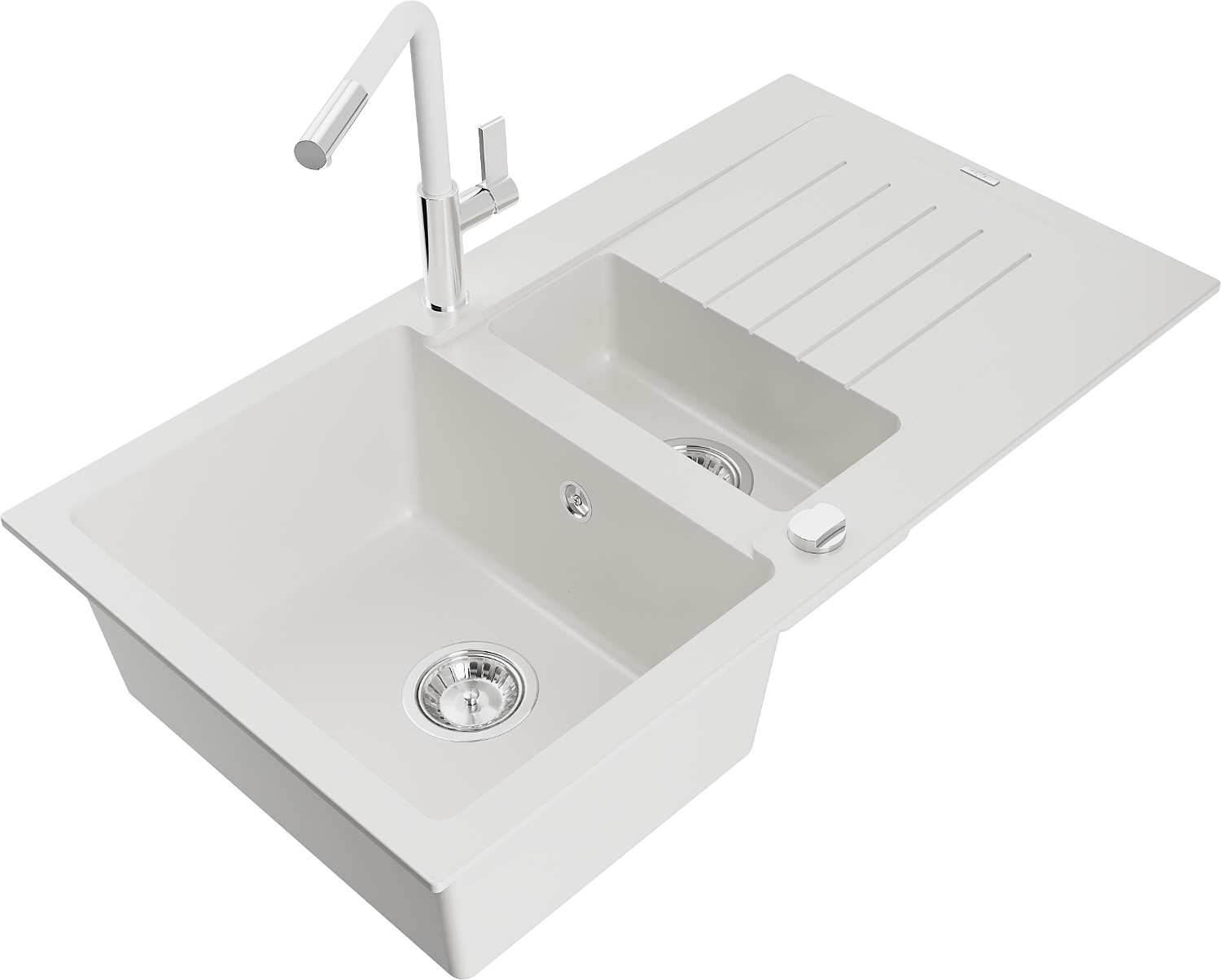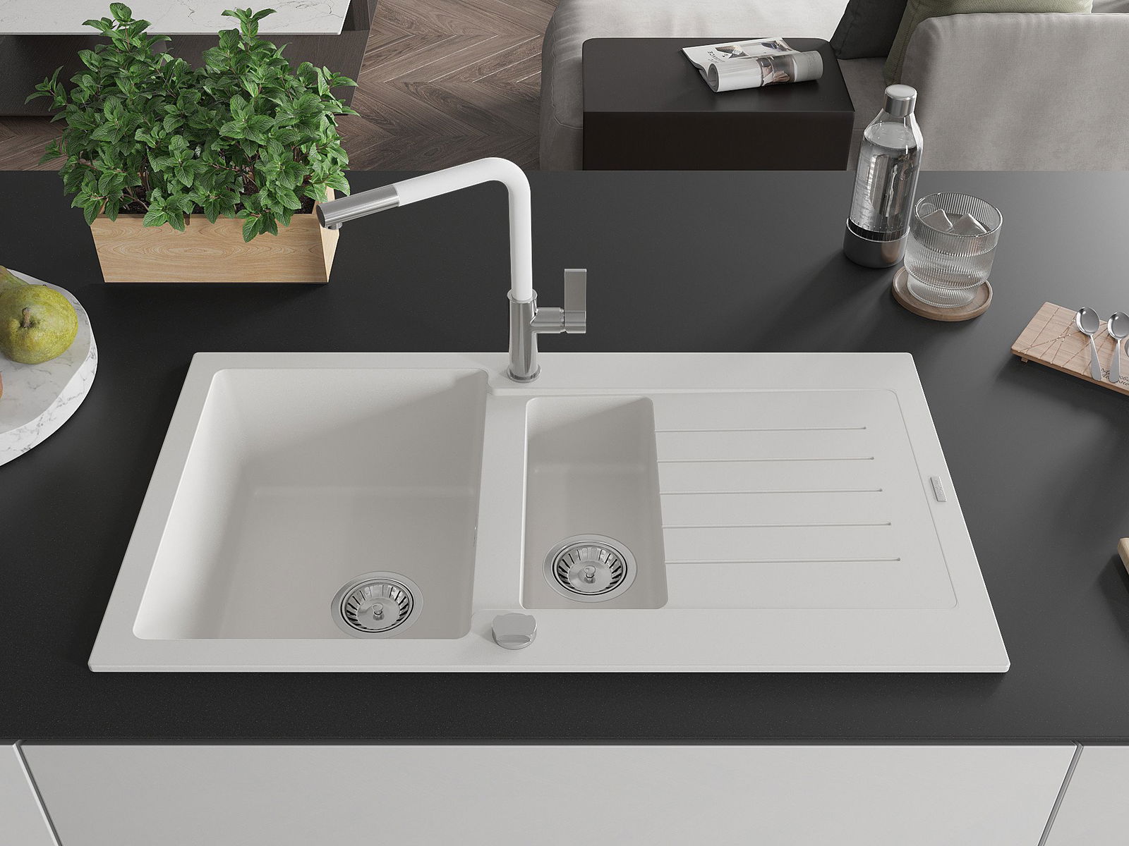Mexen Matias Granite Sink 1.5-Bowl with Drainer and Kitchen Tap Flora, White - 6502-20-670401-02