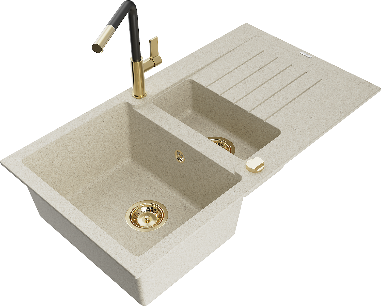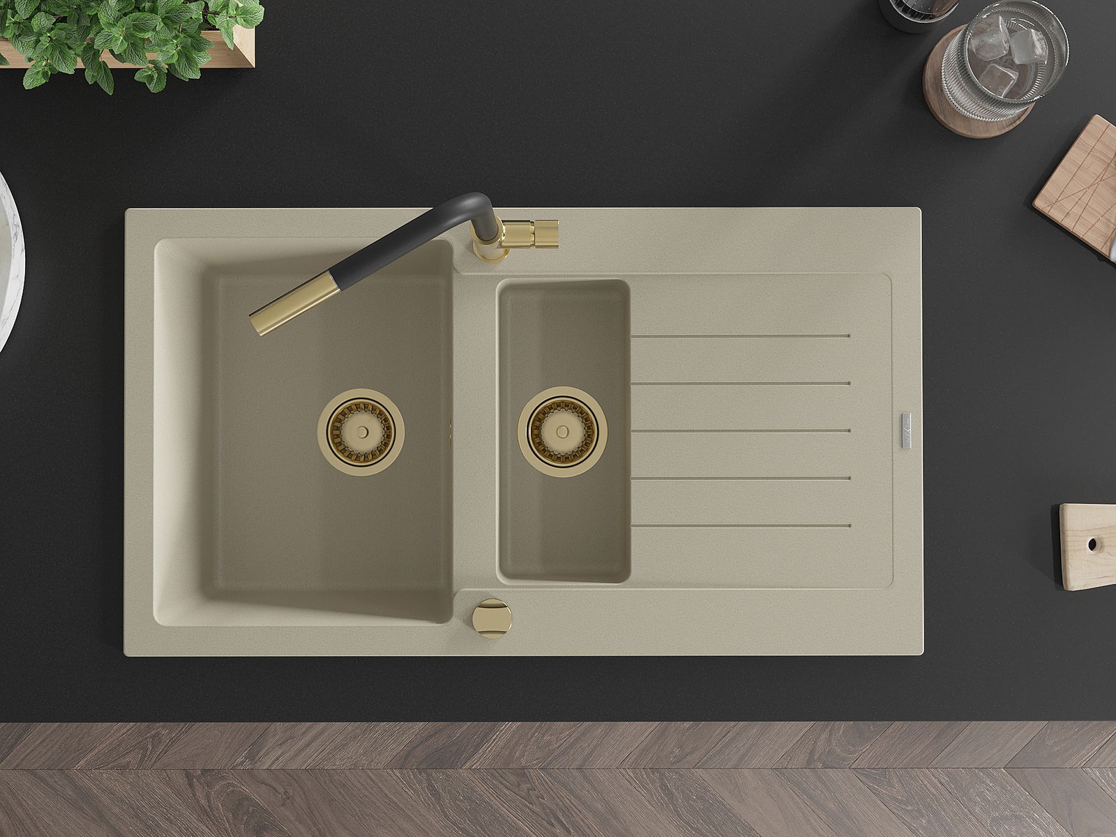 Mexen Matias granite kitchen sink 1.5-bowl with drainer and Flora kitchen tap, beige - 6502-69-670401-57-G