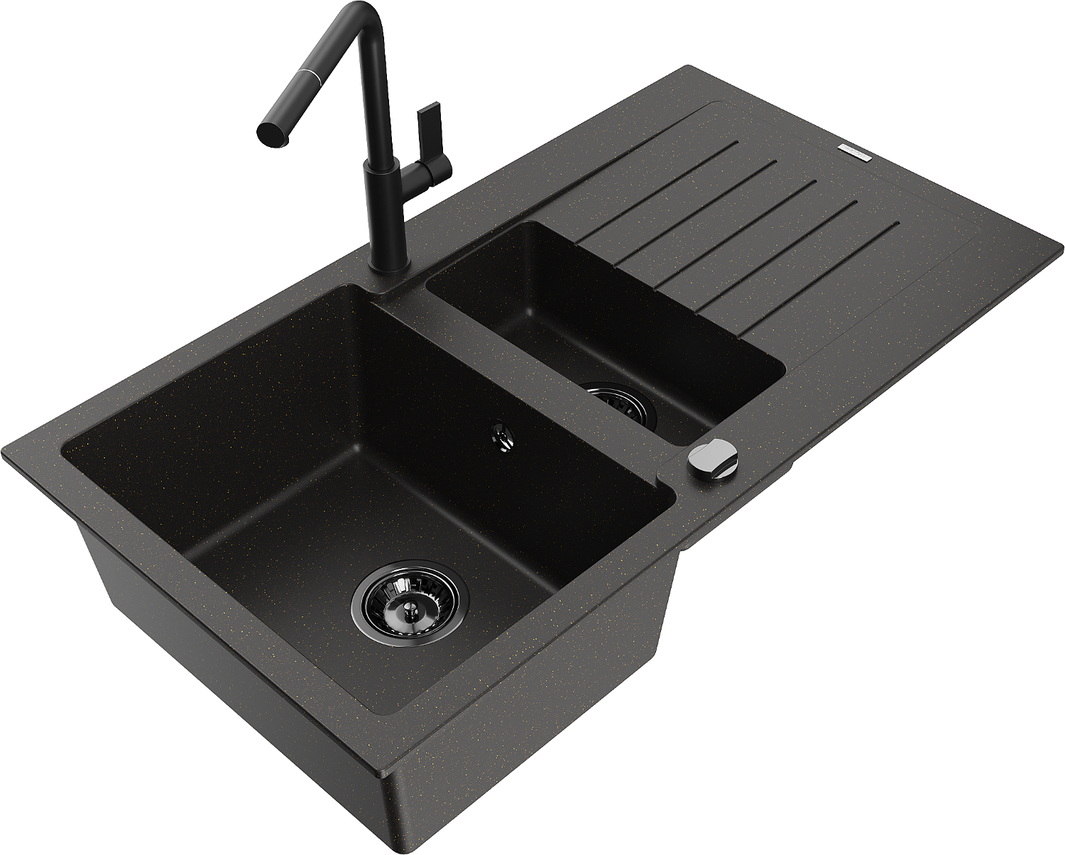 Mexen Matias 1.5-bowl granite sink with drainer and Flora kitchen tap, black/gold - 6502-75-670401-70-B