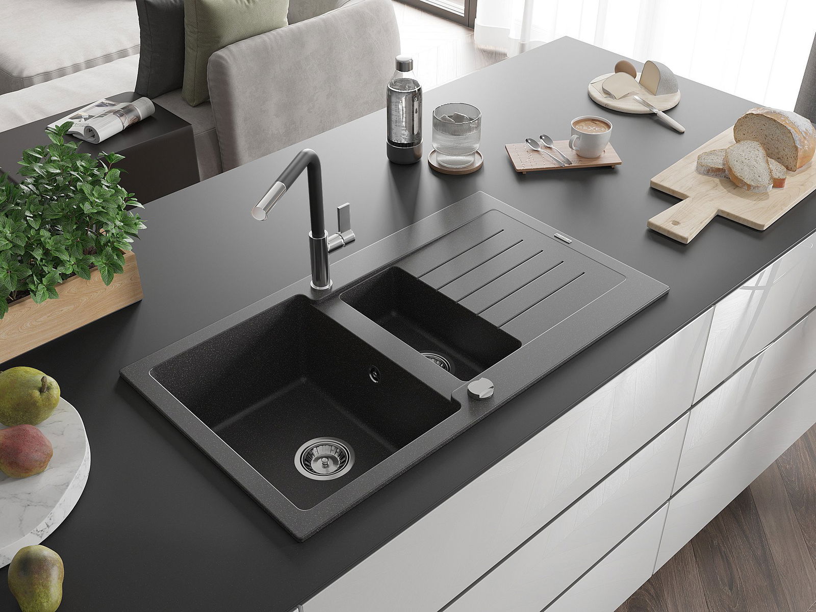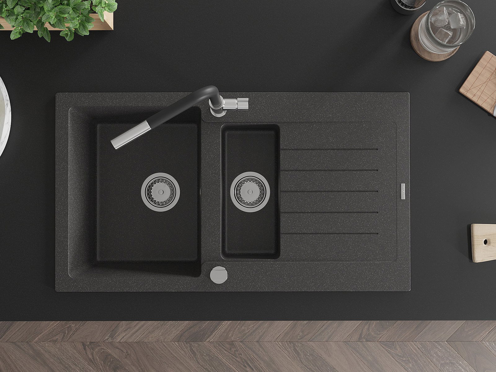 The sink is made of high quality granite. It is an elegant and, above all, practical complement to every kitchen, regardless of its style. High quality and granite durability ensure many years of use.