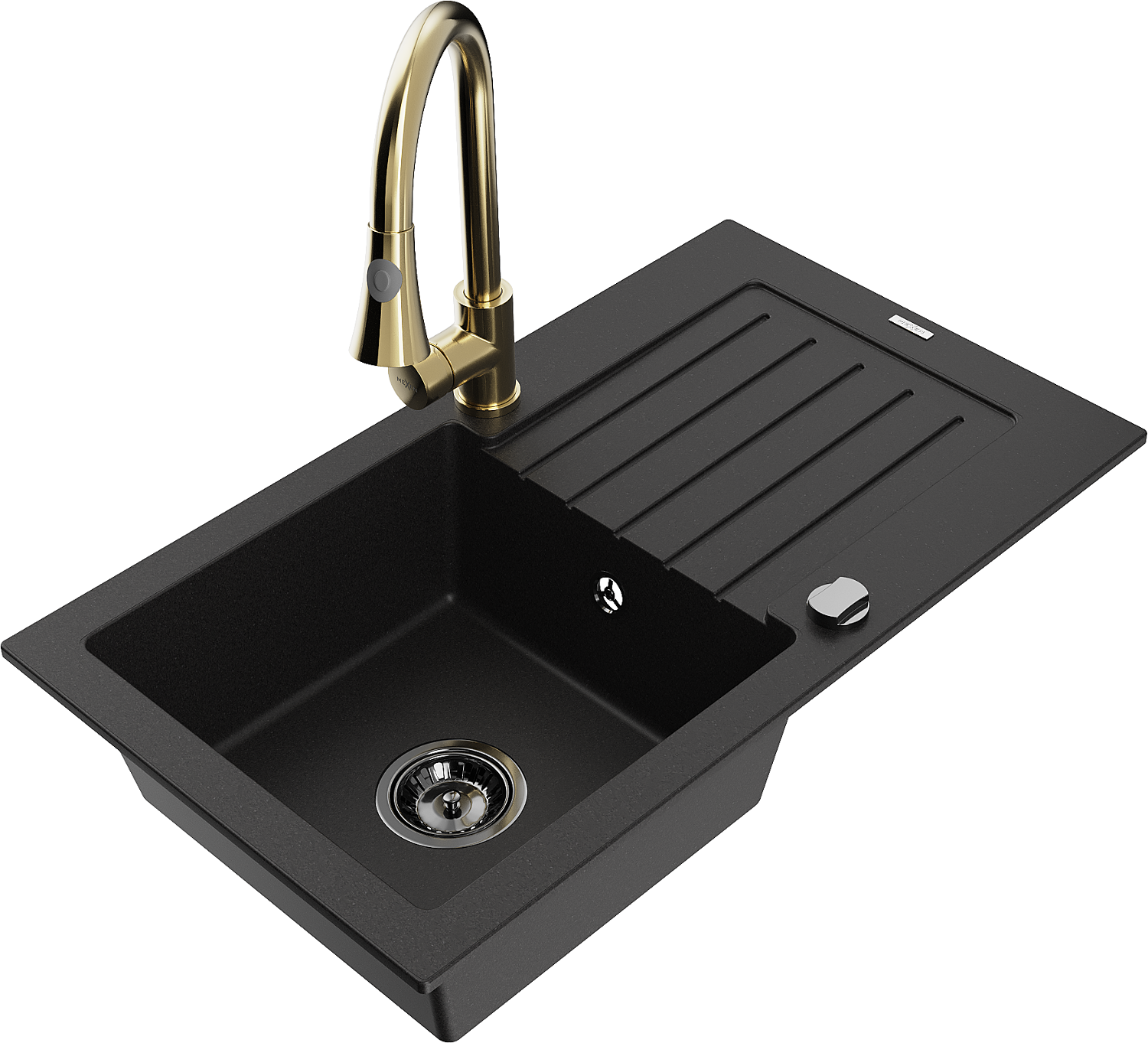 Mexen Pablo granite sink 1-bowl with drainer and Elia kitchen tap, black - 6510-77-670101-50-B
