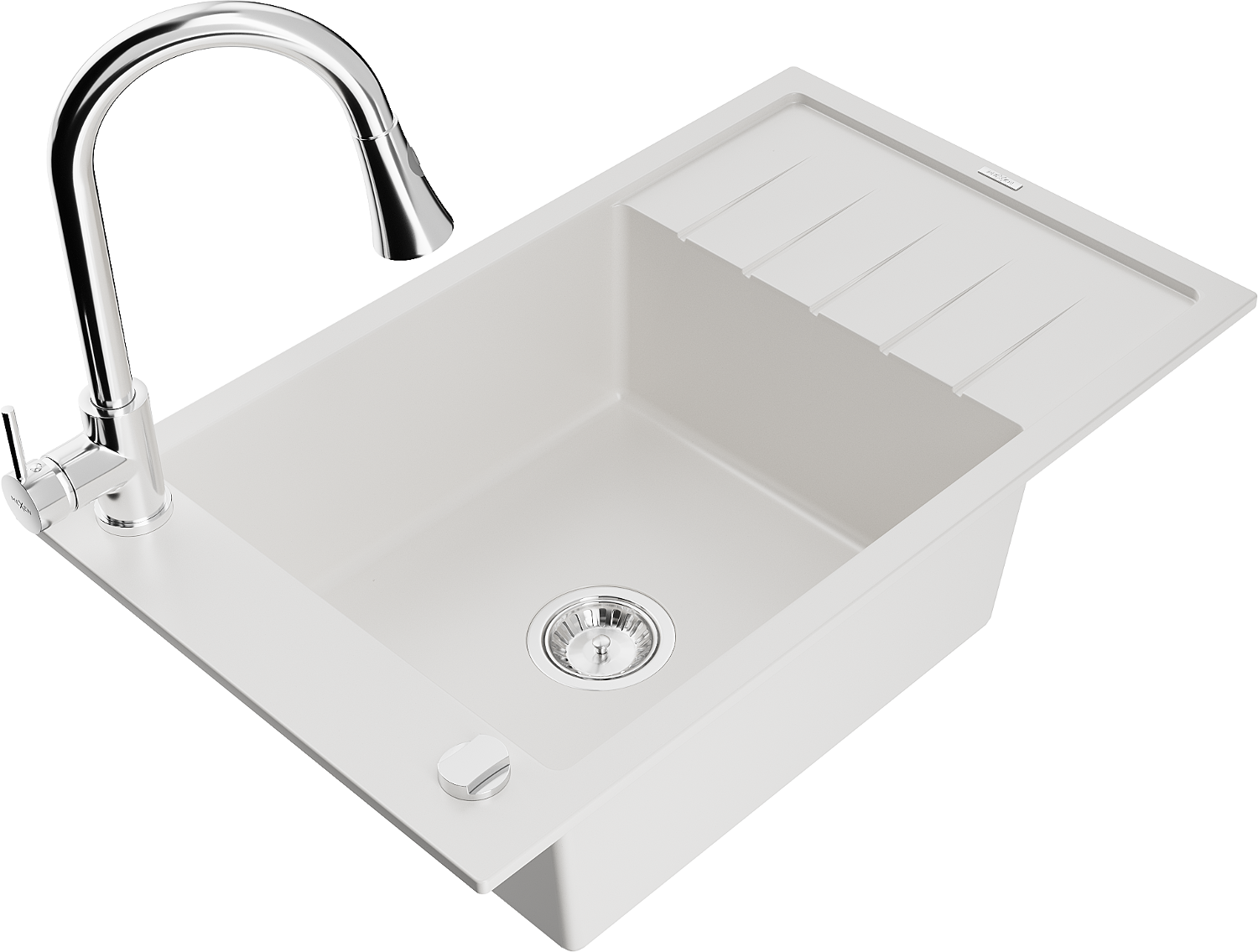 Mexen Elias single-bowl granite sink with drainer and Elia kitchen tap, white - 6511-20-670101-00