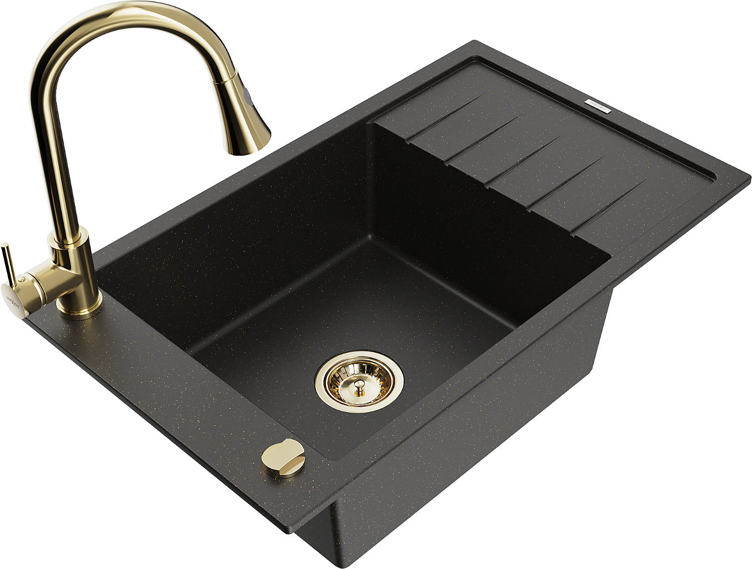 Mexen Elias 1-bowl granite sink with drainer and Elia kitchen tap, black/gold metallic - 6511-75-670101-50