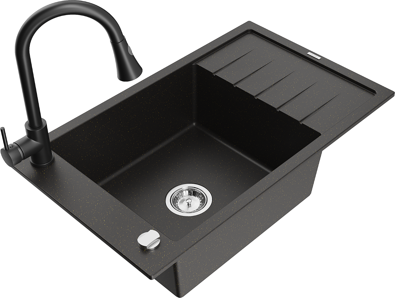 Mexen Elias granite sink 1-bowl with drainer and kitchen tap Elia, black/gold metallic - 6511-75-670101-70