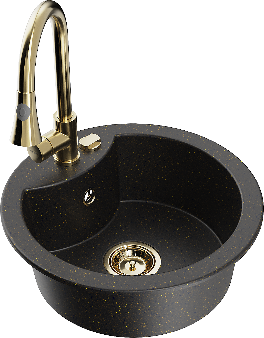 Mexen Diego Single Bowl Granite Sink with Elia Kitchen Tap, Black/Gold Metallic - 6512-75-670101-50