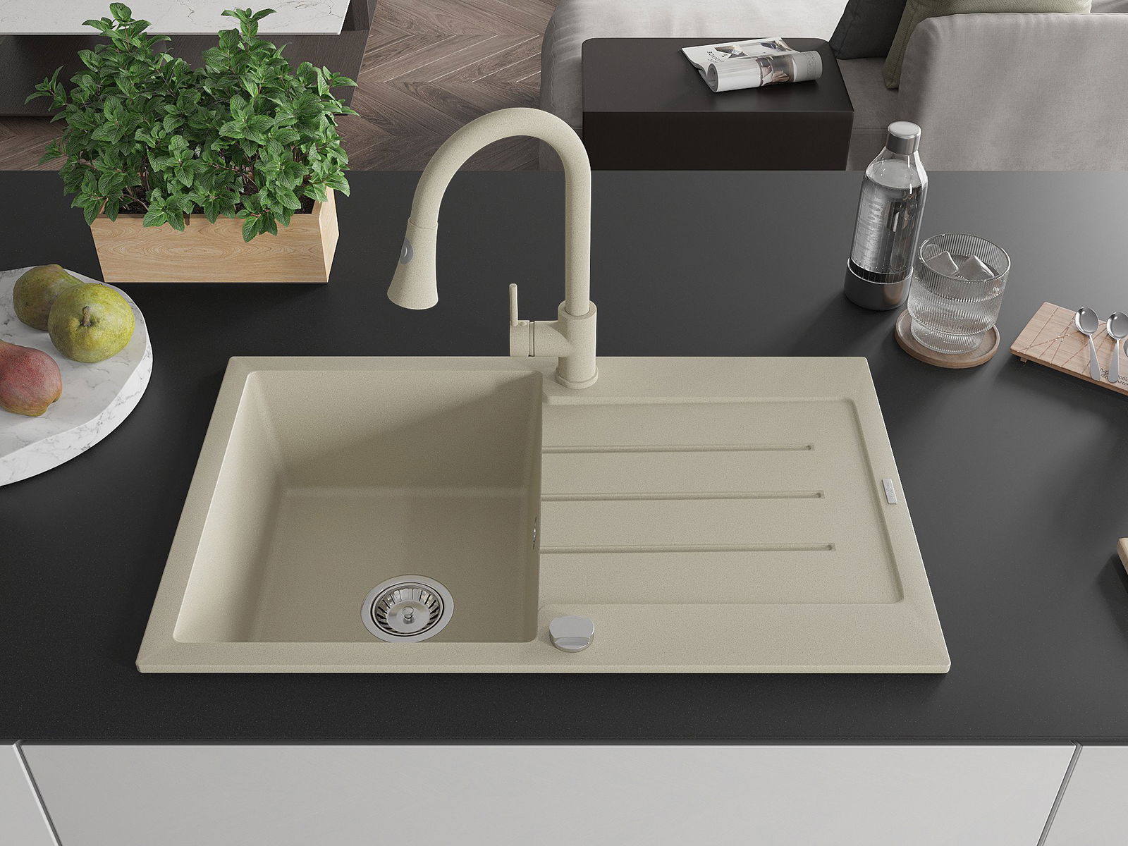 Mexen Bruno 1-Bowl Granite Kitchen Sink with Drainer and Elia Tap, Beige - 6513-69-670101-69