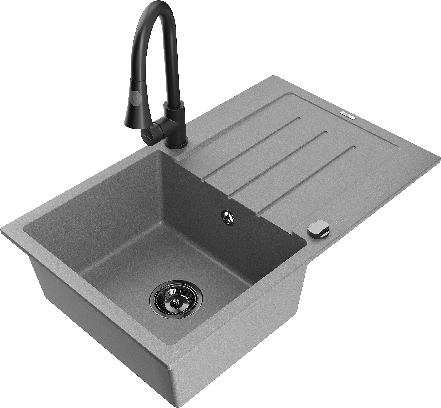 Mexen Bruno granite sink 1-bowl with drainer and Elia kitchen tap, grey - 6513-71-670101-70-B