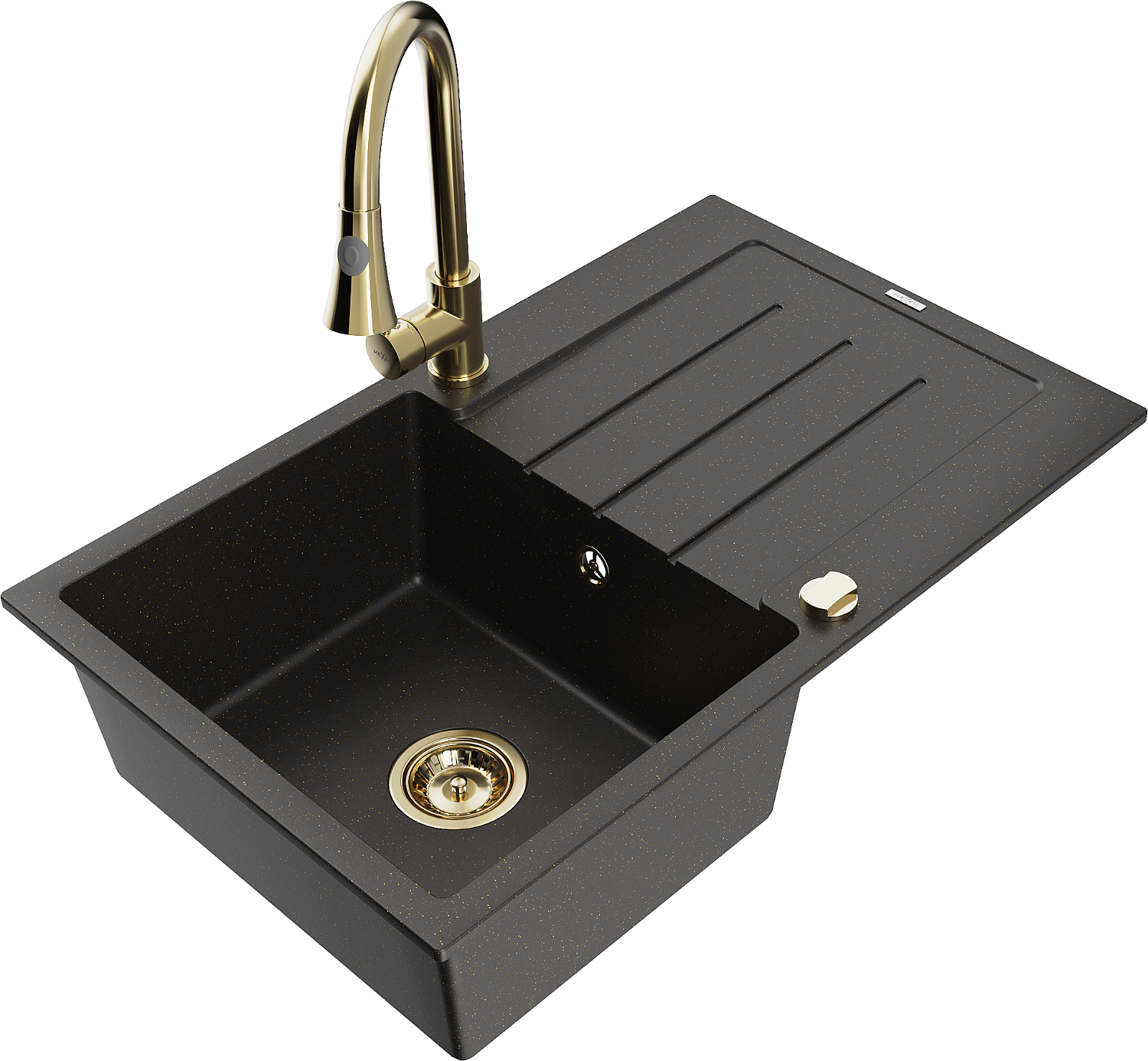 Mexen Bruno granite sink 1-bowl with drainer and Elia kitchen tap, black/gold metallic - 6513-75-670101-50
