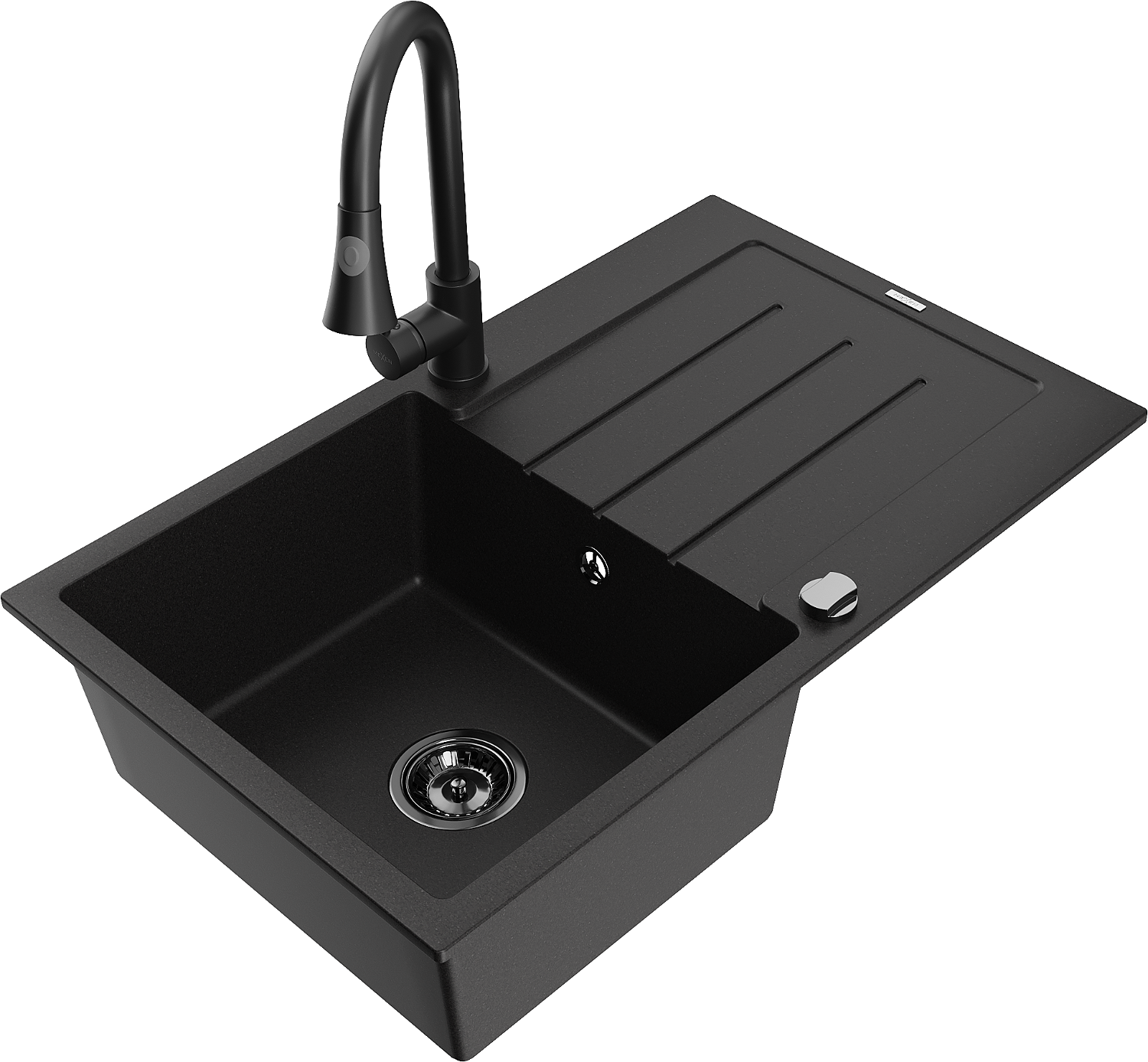 Mexen Bruno 1-bowl granite sink with drainer and Elia kitchen tap, black - 6513-77-670101-70-B