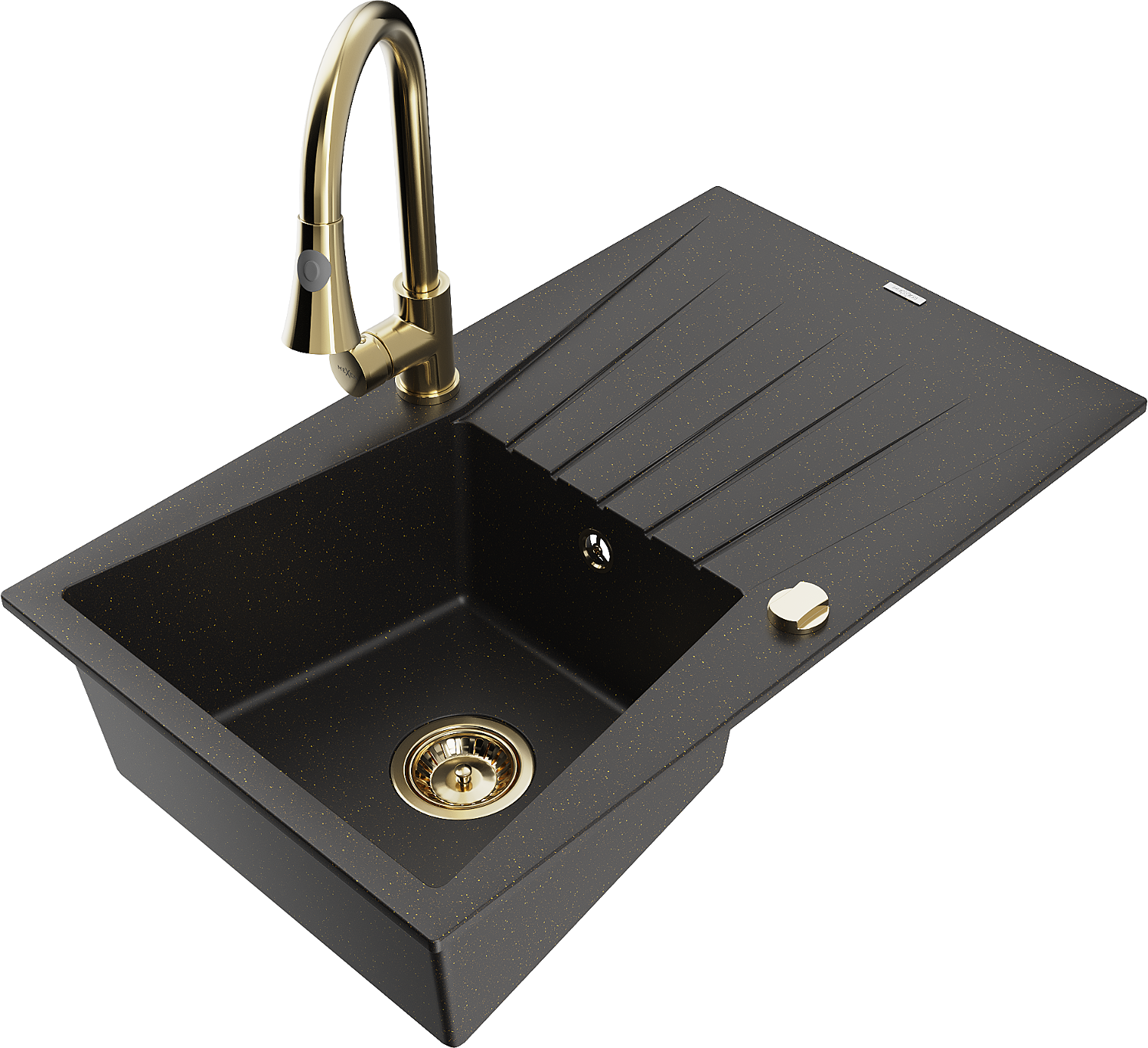 Mexen Cesar granite sink 1-bowl with drainer and Elia kitchen tap, black/gold metallic - 6514-75-670101-50