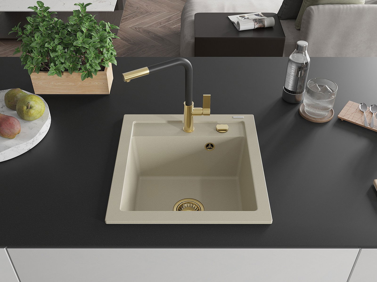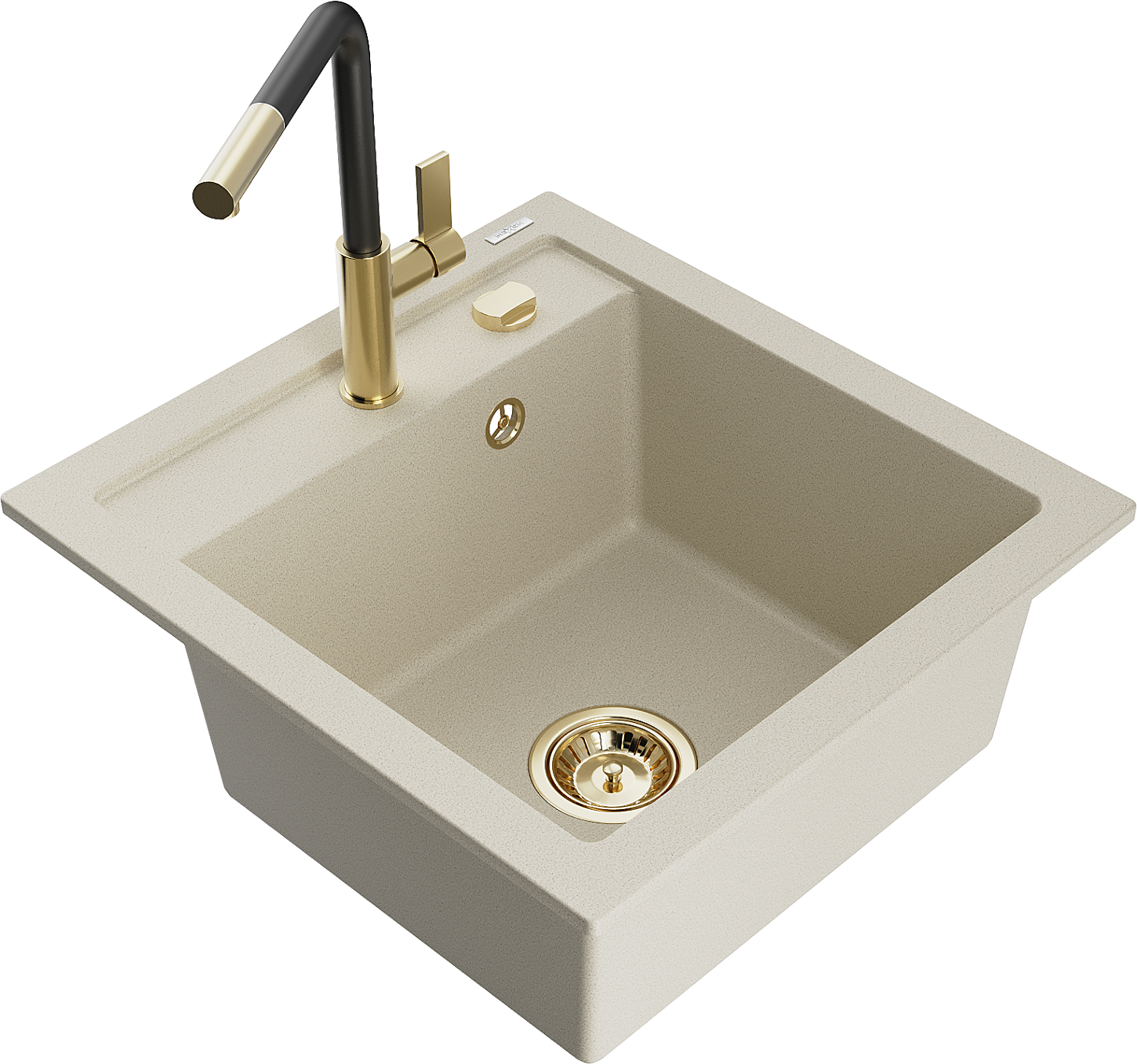 Mexen Vito 1-bowl granite kitchen sink with Flora kitchen tap, beige - 6503-69-670401-57-G