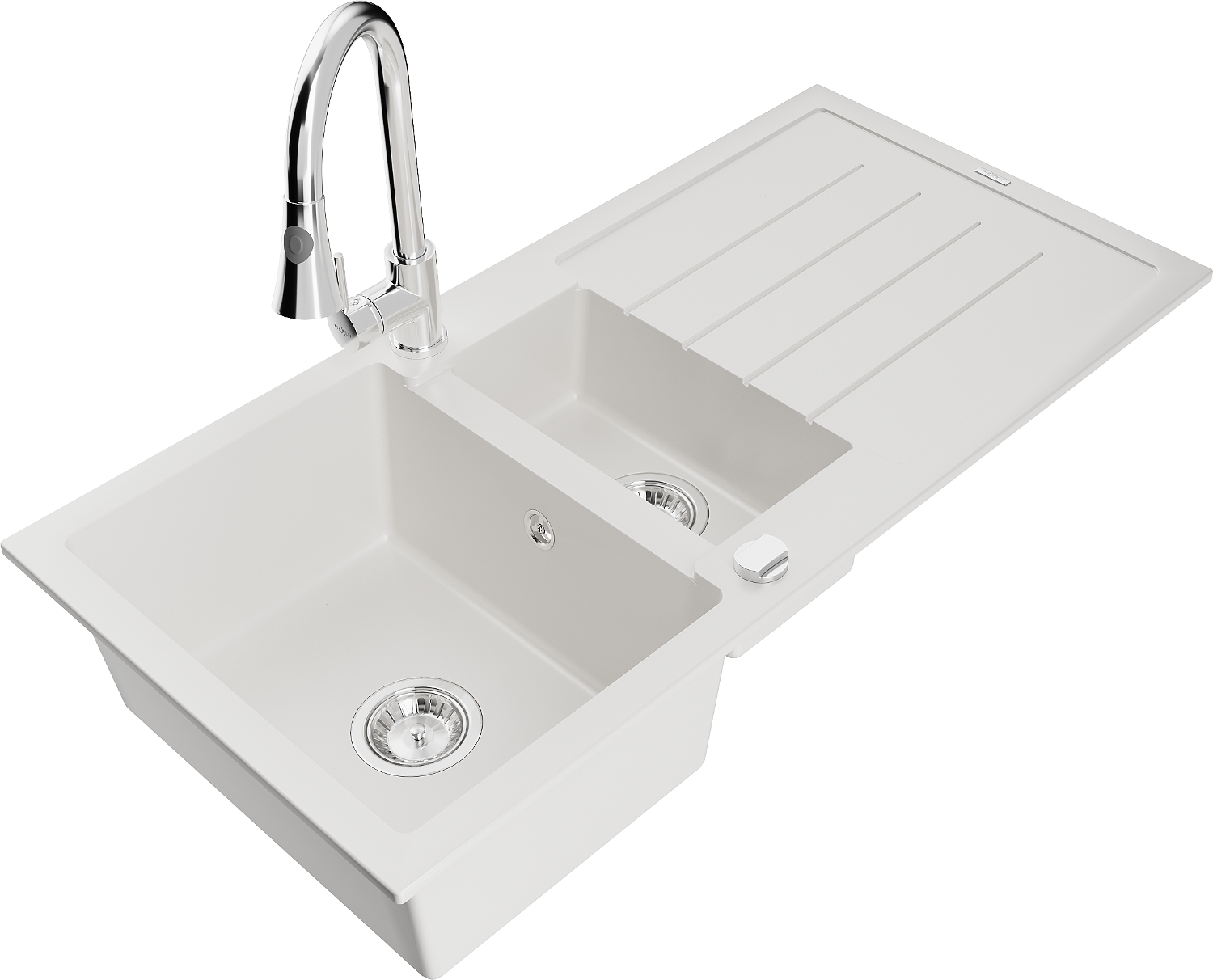Mexen Andres granite sink 1.5-bowl with drainer and Elia kitchen tap, white - 6515-20-670101-00