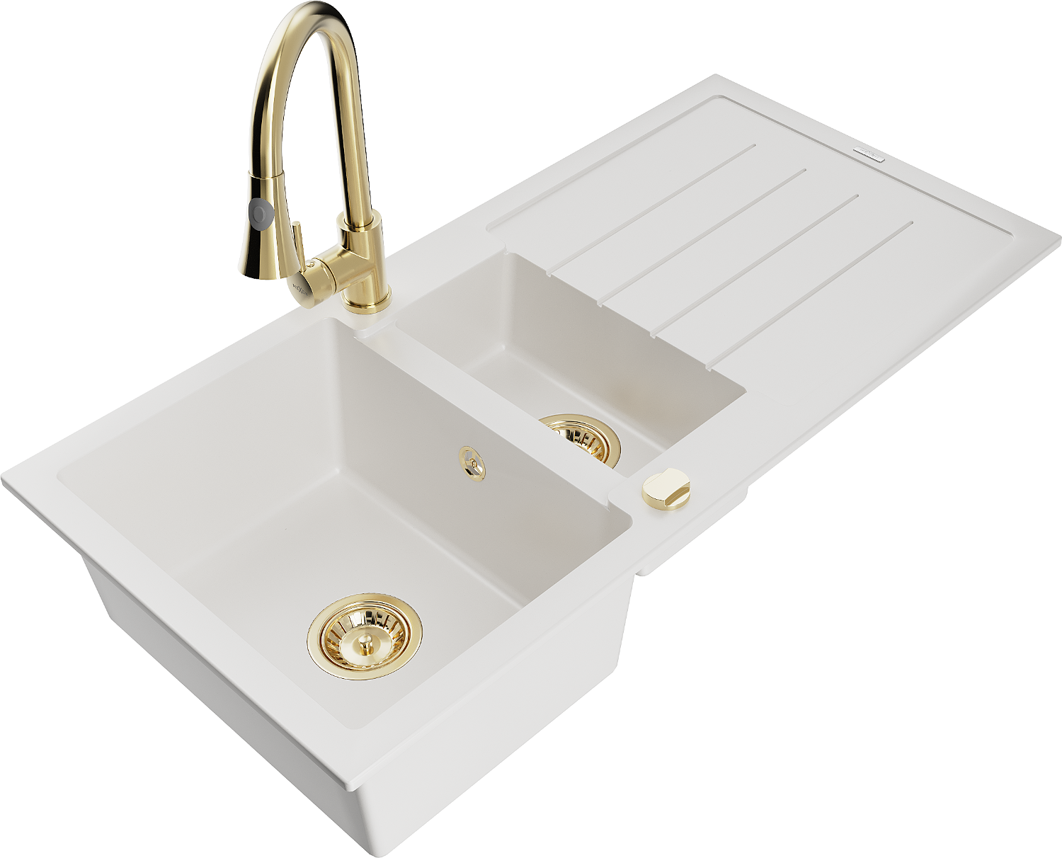 Mexen Andres 1.5-bowl granite sink with drainer and Elia kitchen tap, white - 6515-20-670101-50