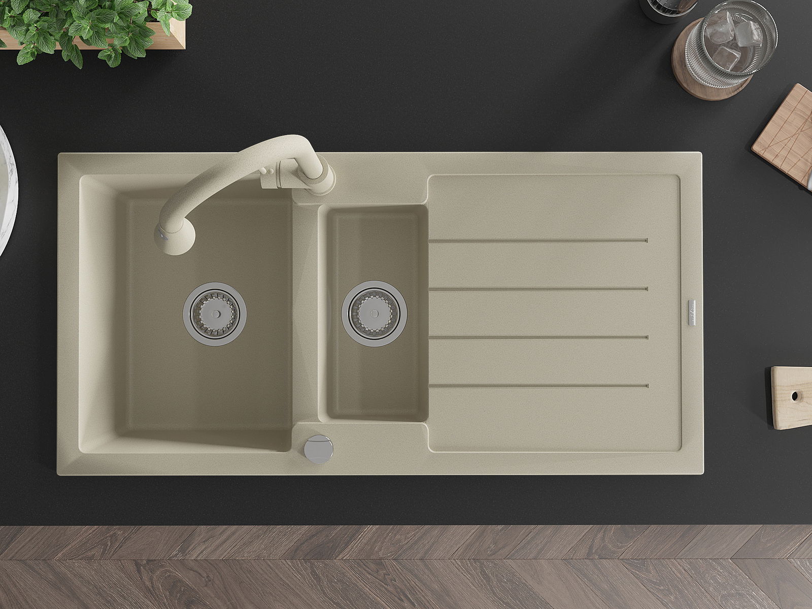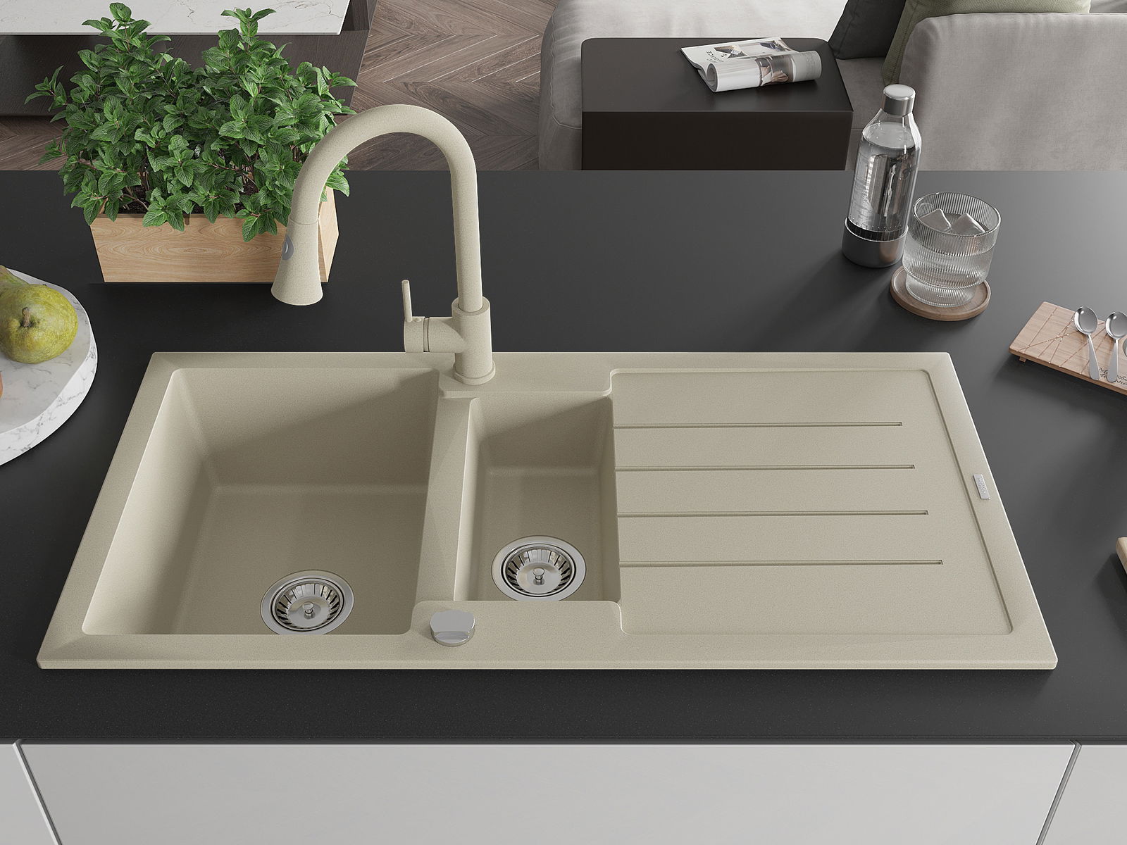 The sink is made of high quality granite. It is an elegant and, above all, practical complement to every kitchen, regardless of its style. High quality and granite durability ensure many years of use.