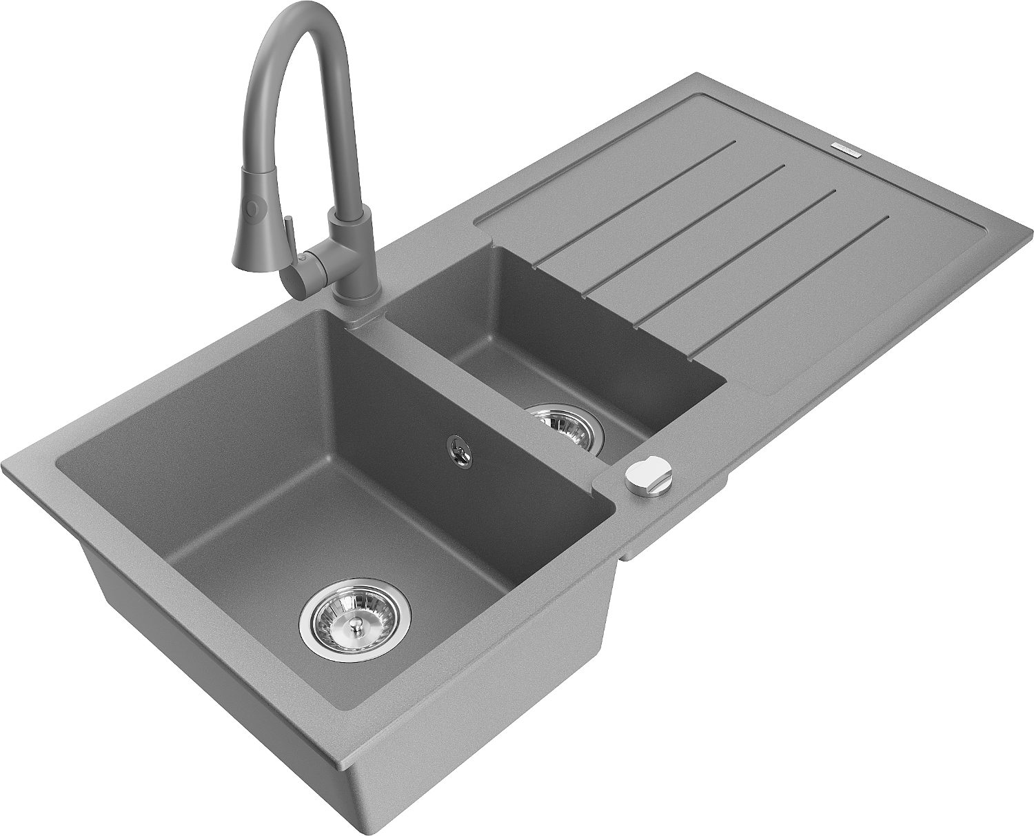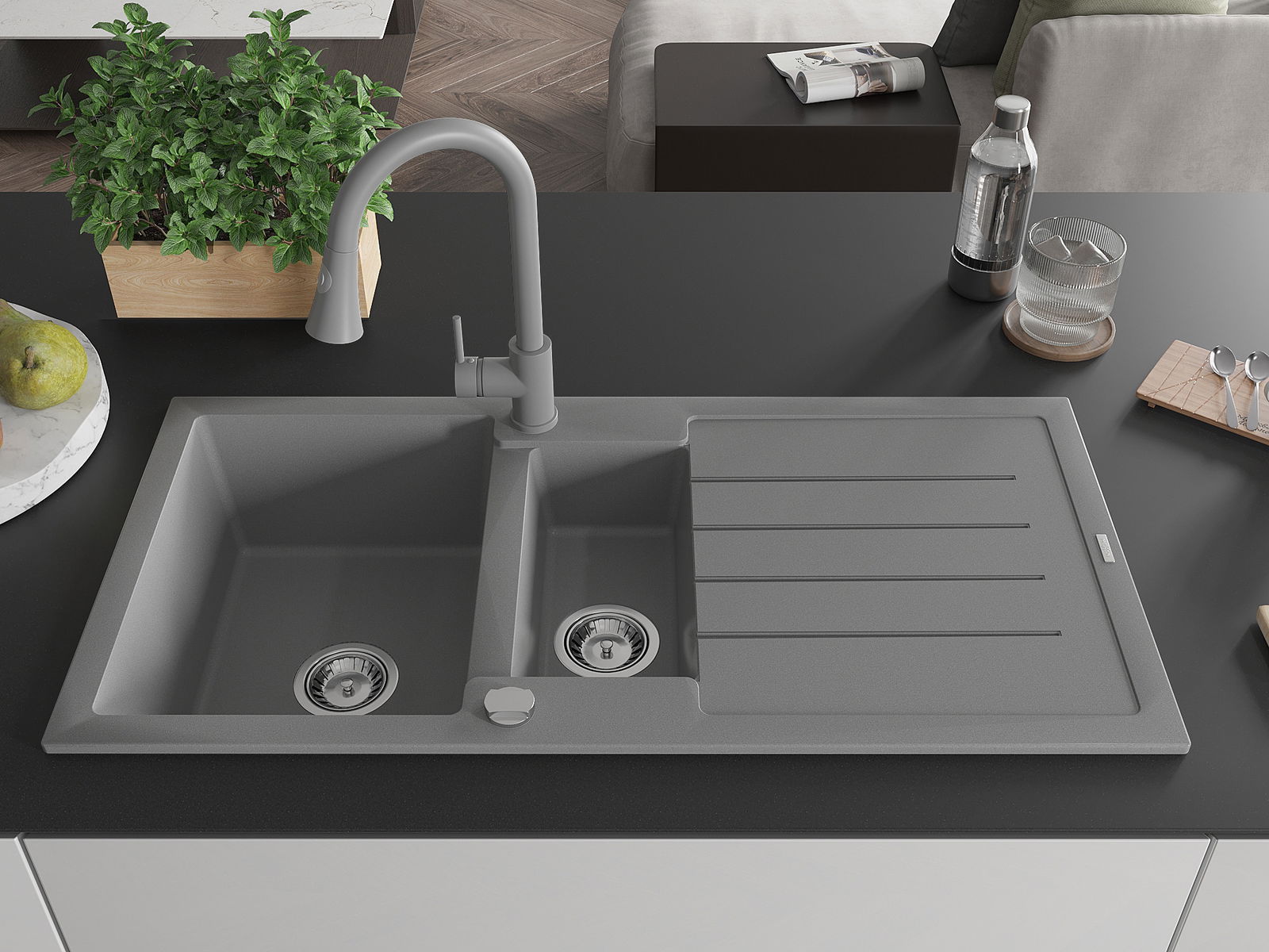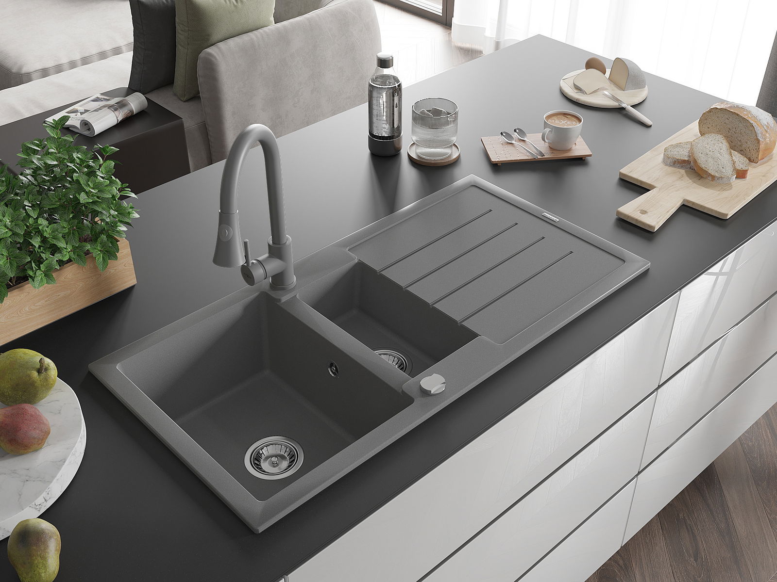 Mexen Andres granite kitchen sink 1.5-bowl with drainer and Elia kitchen tap, grey - 6515-71-670101-71