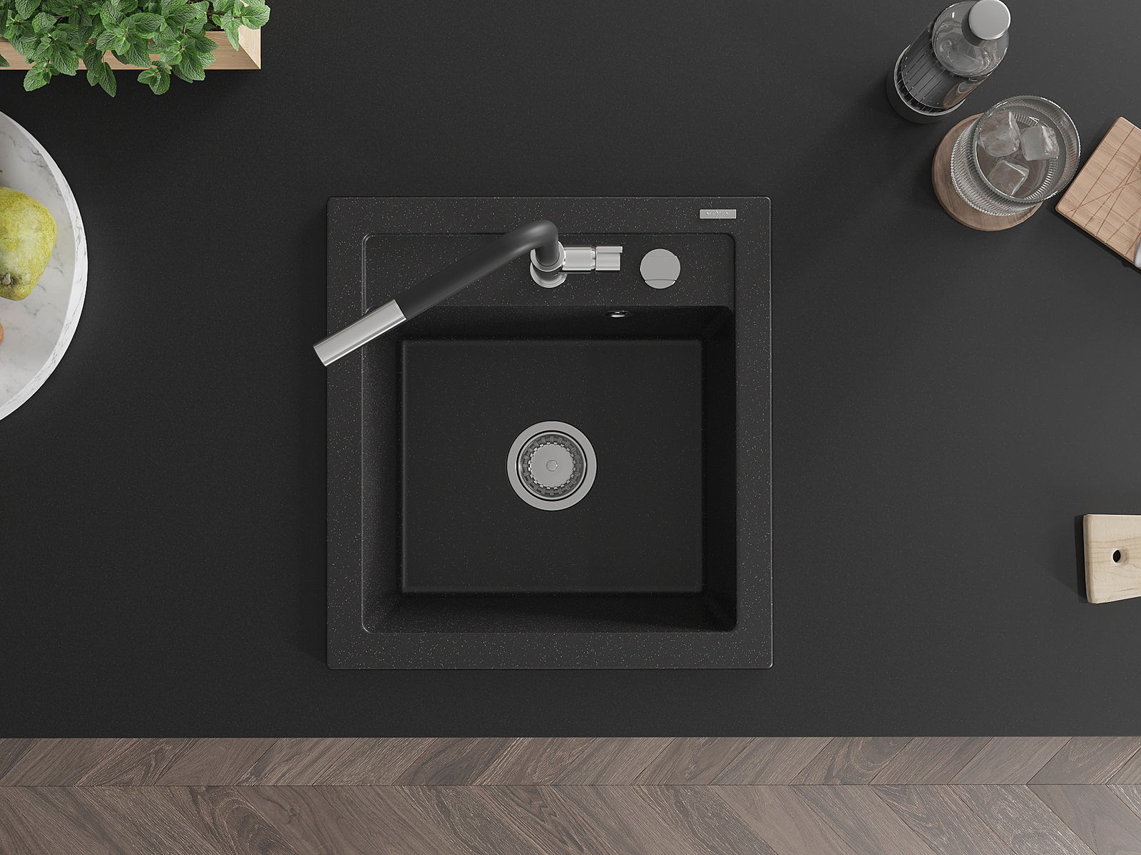 Mexen Vito granite sink 1-bowl with Flora kitchen tap, black/silver metallic - 6503-73-670401-07