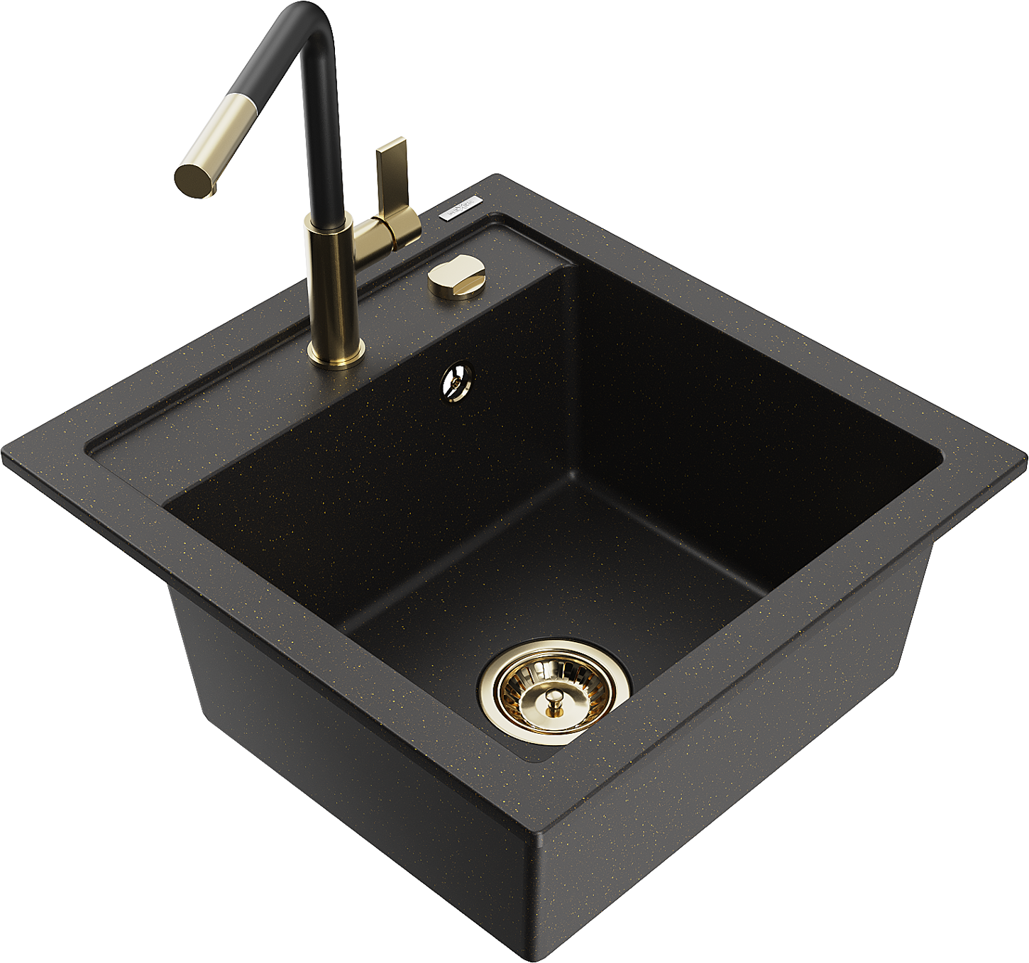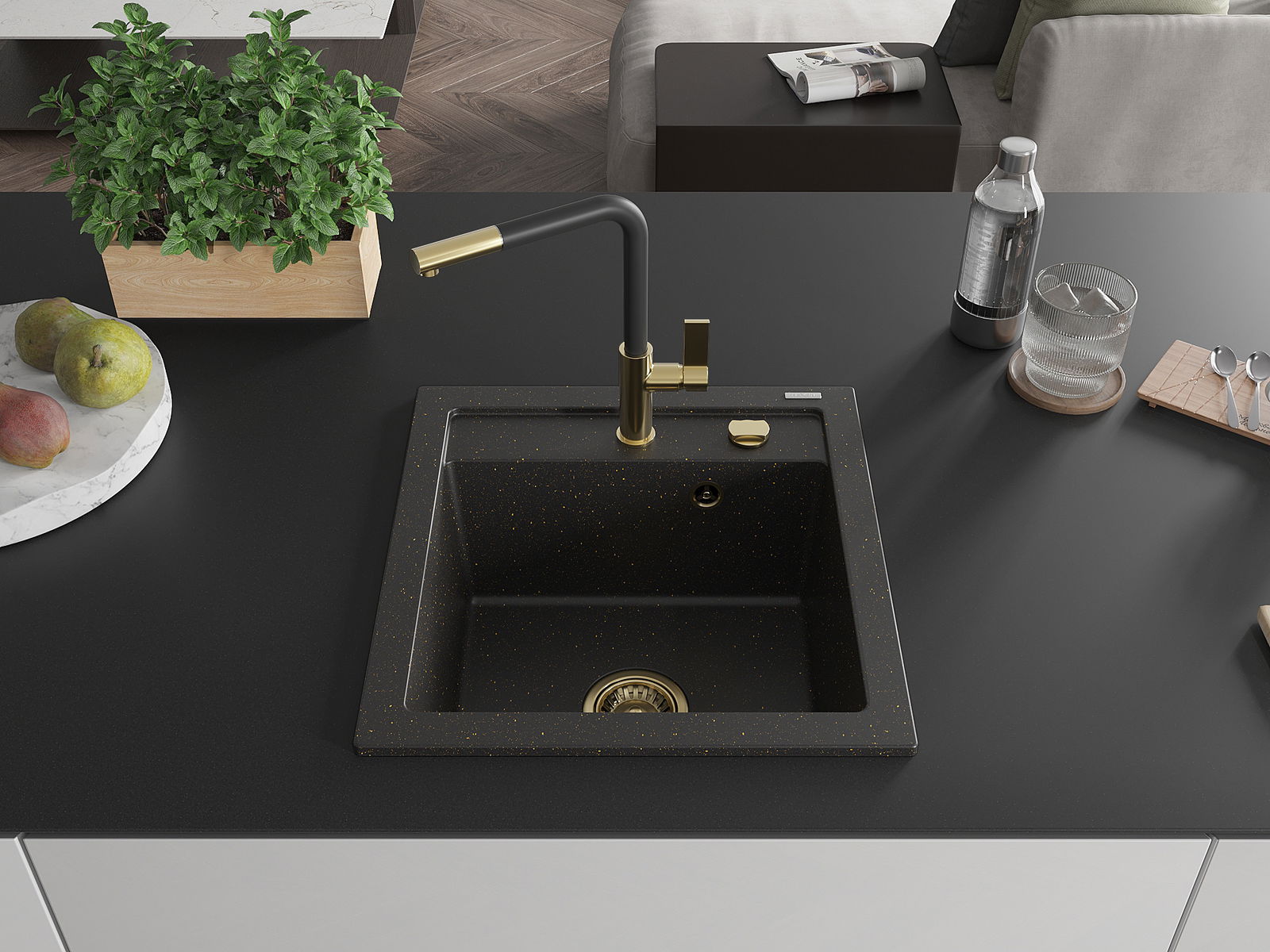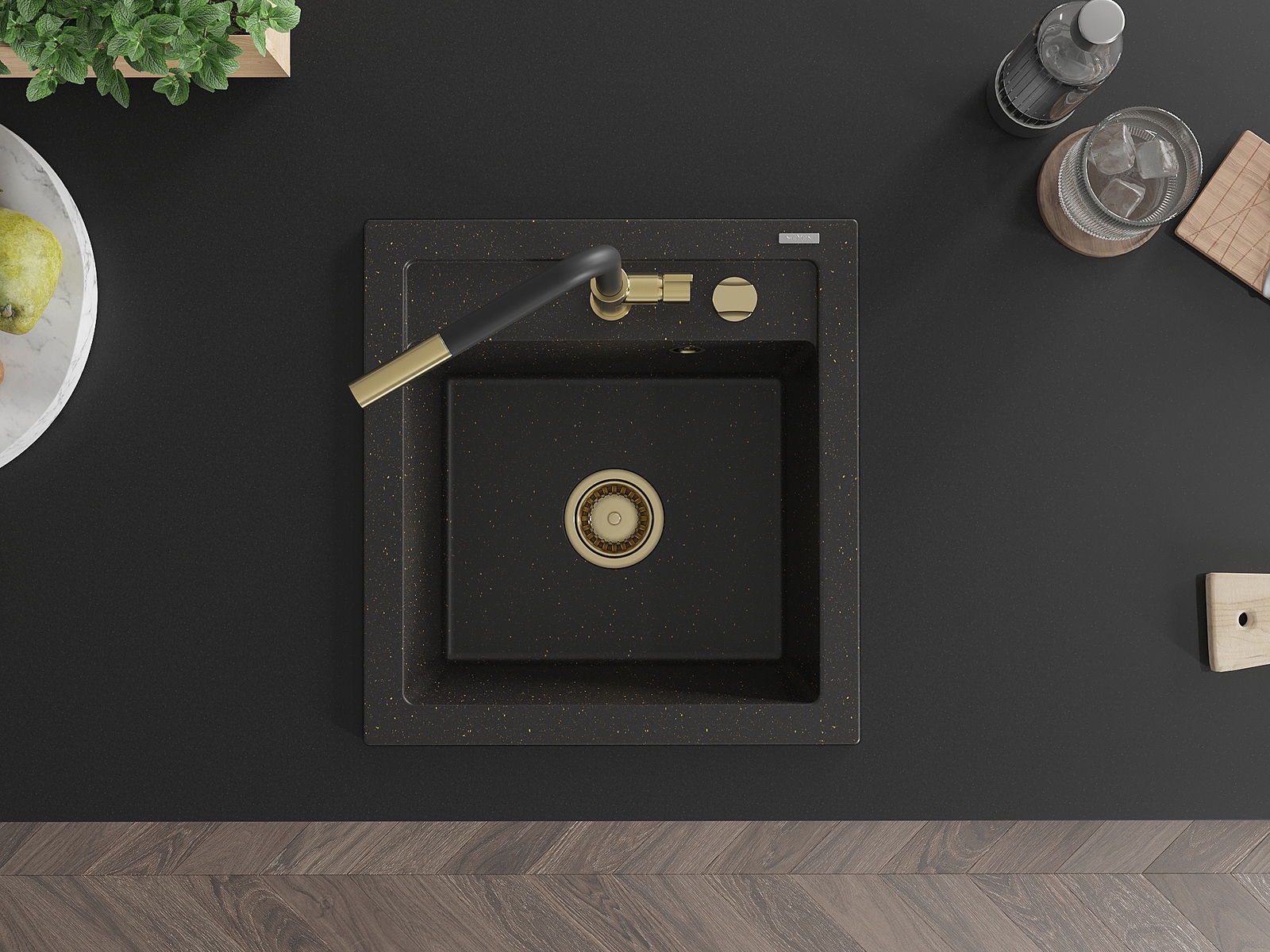 Mexen Vito Granite Sink Single-Bowl with Flora Kitchen Tap, Black/Gold Metallic - 6503-75-670401-57-G