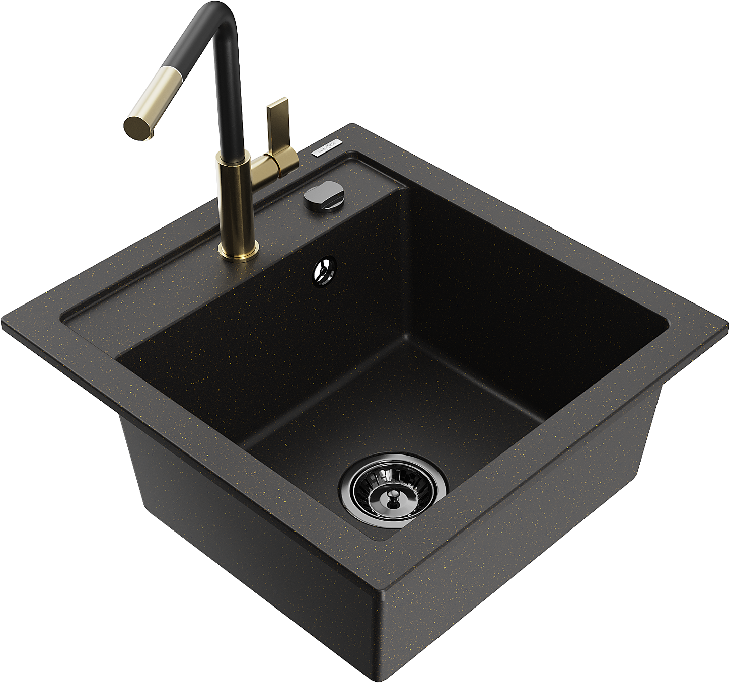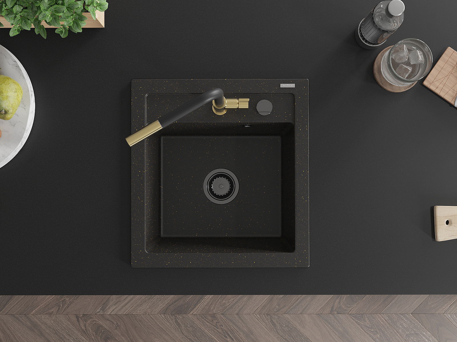 Mexen Vito Granite Sink 1-Bowl with Flora Kitchen Tap, Black/Gold Metallic - 6503-75-670401-57-B