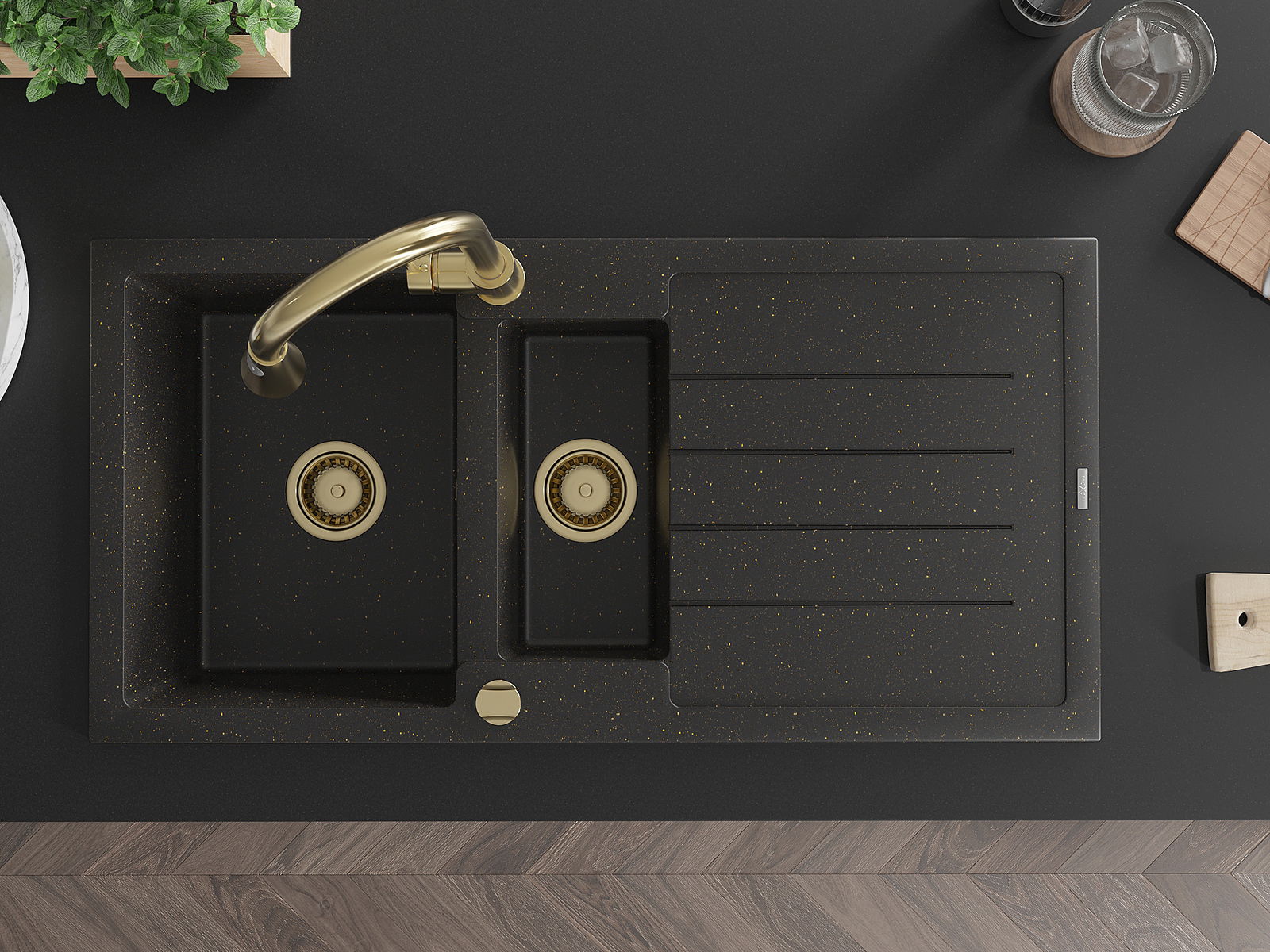 Mexen Andres granite sink 1.5-bowl with drainer and Elia kitchen tap, black/gold metallic - 6515-75-670101-50