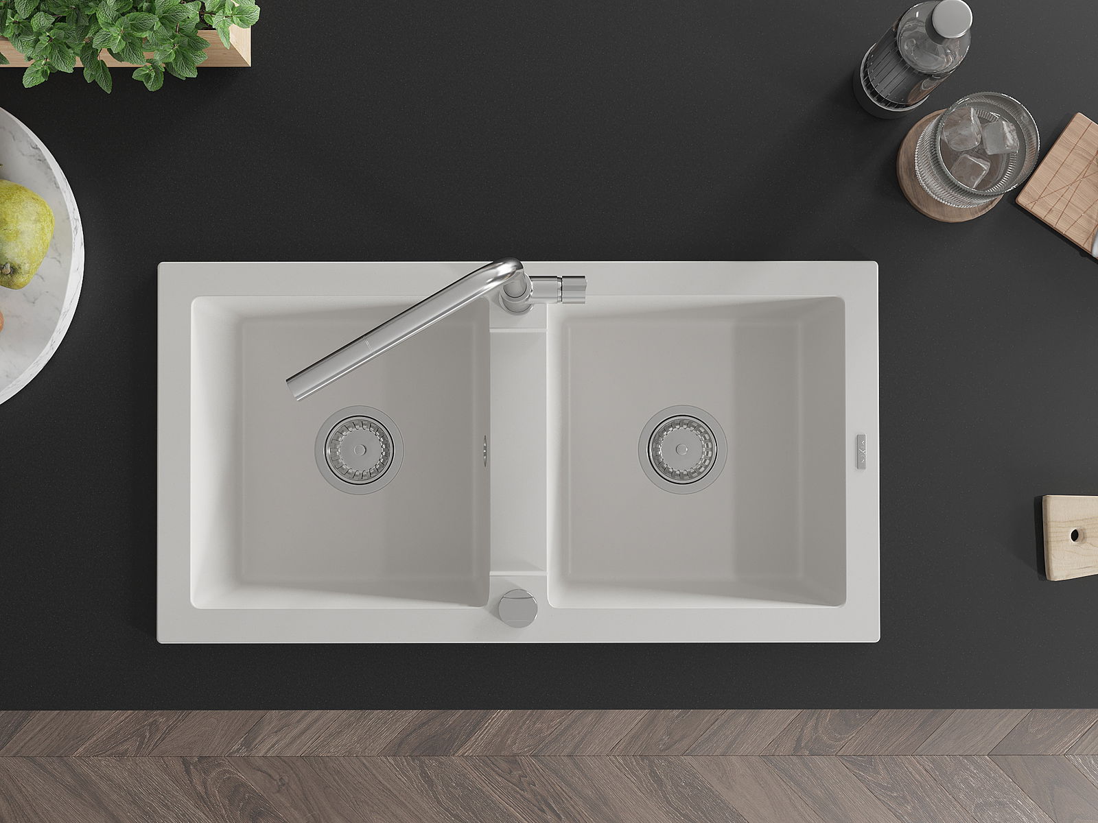 Mexen Mario granite kitchen sink 2-bowl with Flora kitchen tap, white - 6504-20-670401-00