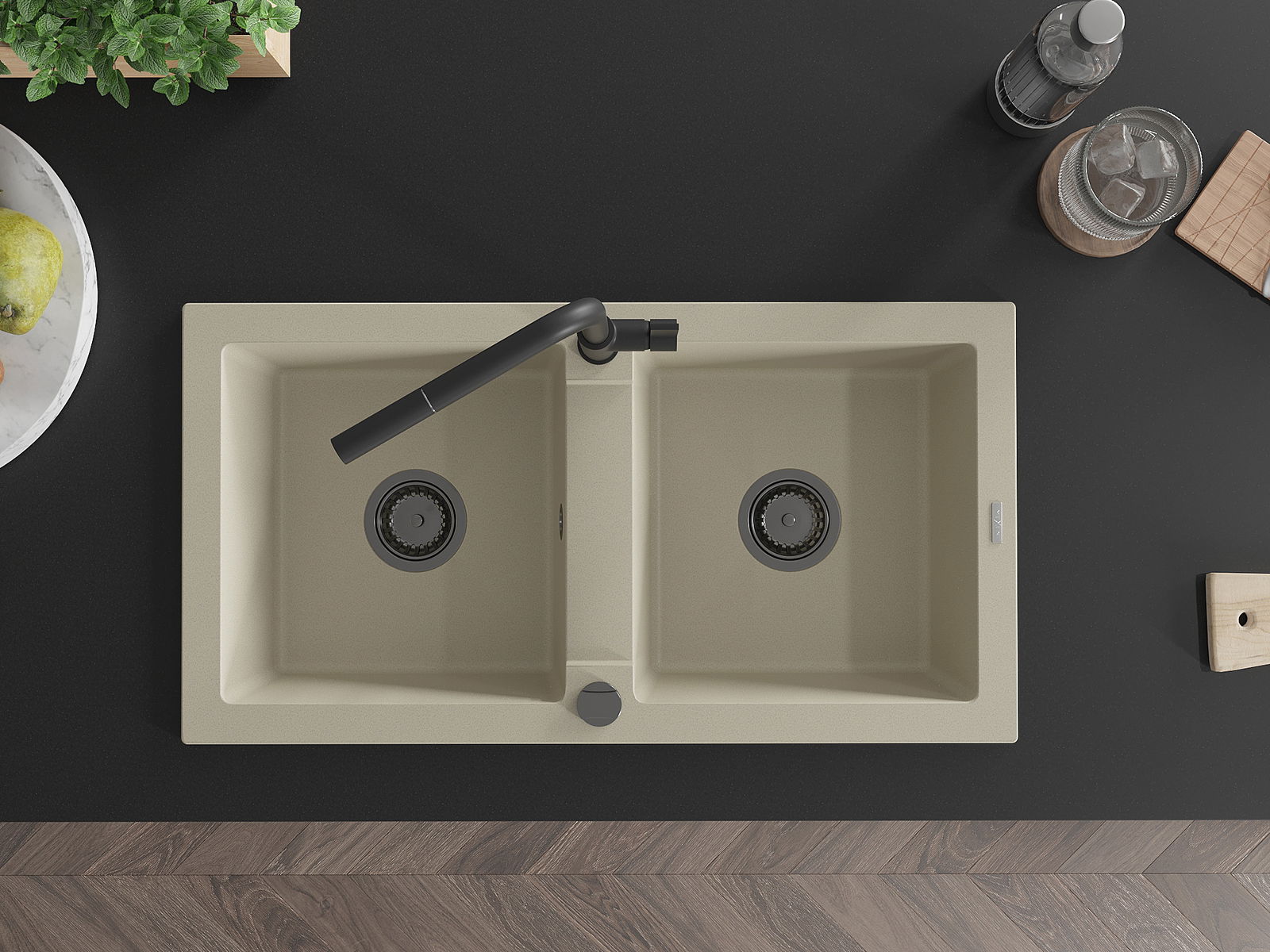 Mexen Mario 2-basin Granite Sink with Flora Kitchen Faucet, Beige - 6504-69-670401-70-B