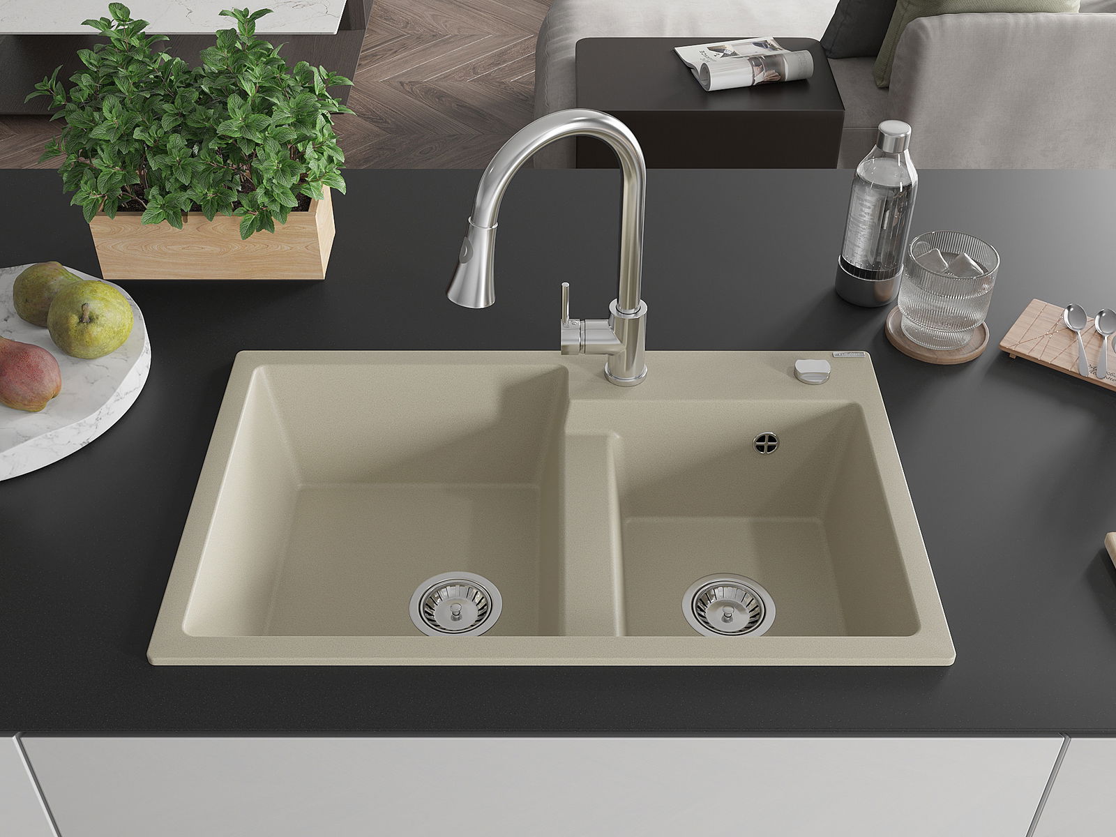 Mexen Tomas 2-bowl granite sink with Elia kitchen tap, beige - 6516-69-670101-00