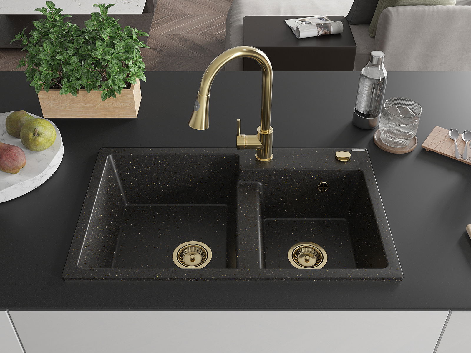 Mexen Tomas granite sink 2-bowl with kitchen tap Elia, black/gold metallic - 6516-75-670101-50
