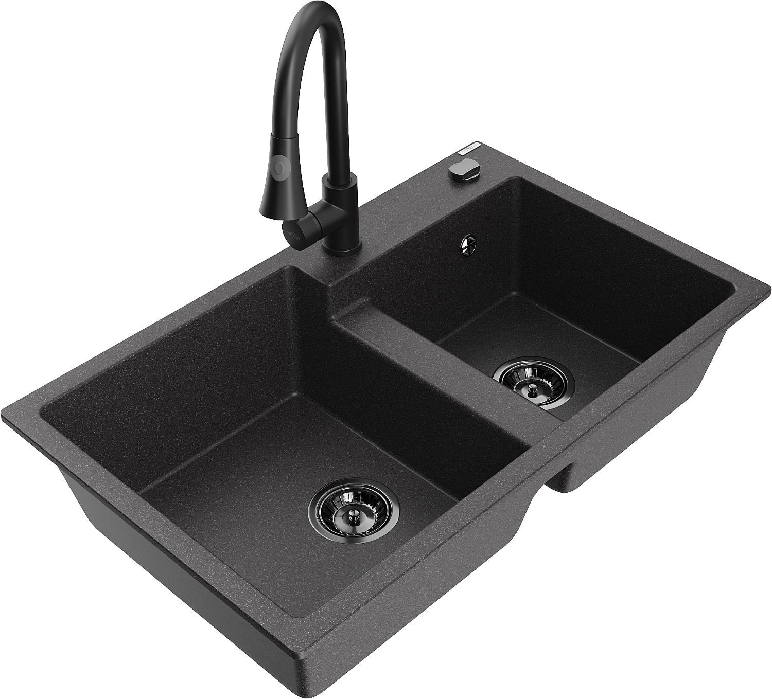 Mexen Tomas granite sink 2-chamber with kitchen tap Elia, black speckled - 6516-76-670101-70-B