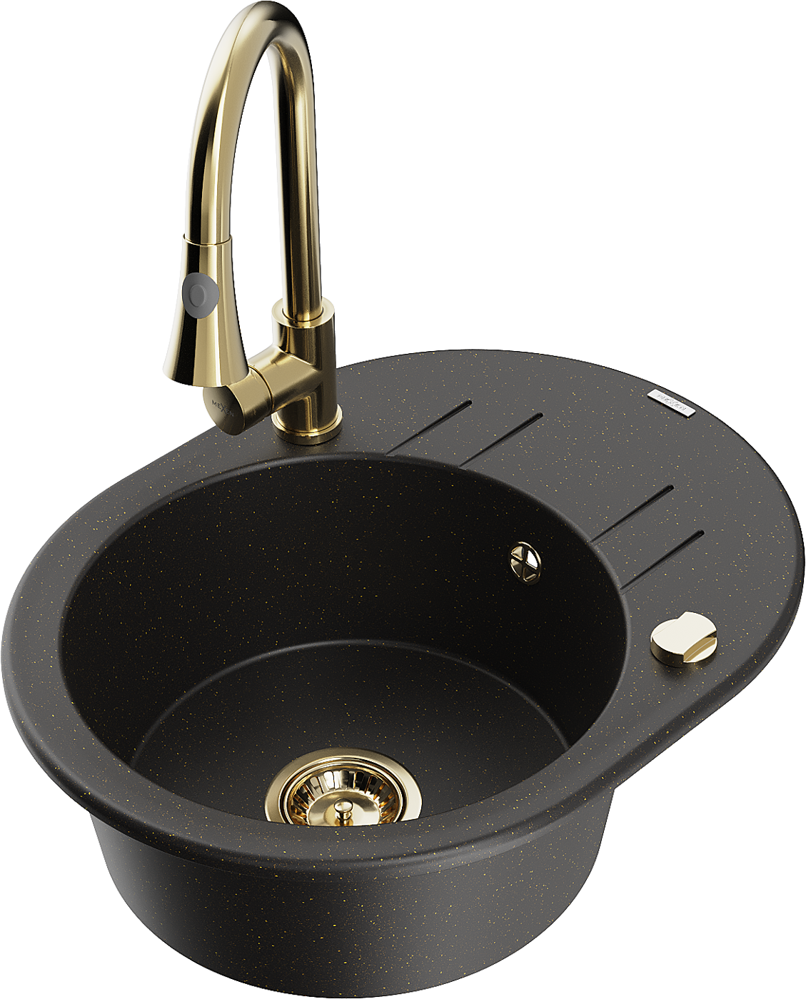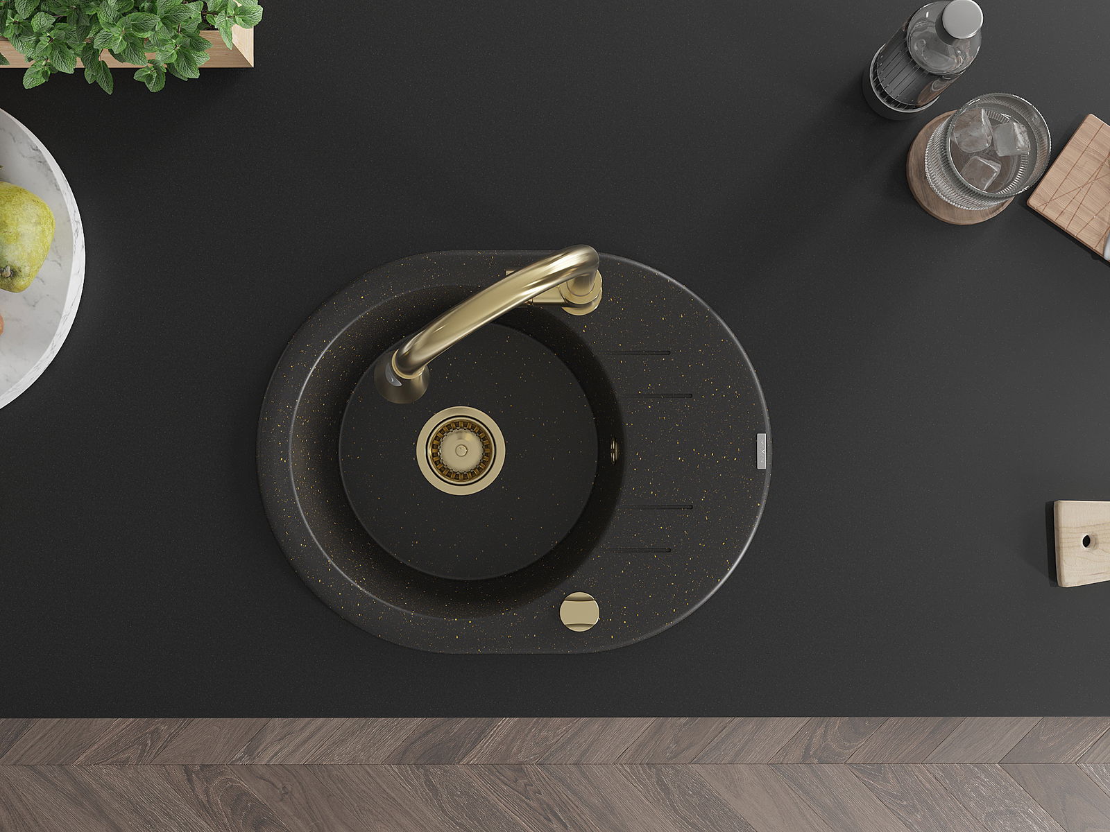 Mexen Kevin granite sink 1-bowl with drainer and Elia kitchen tap, black/gold metallic - 6517-75-670101-50