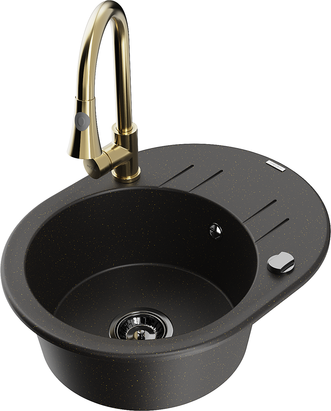 Mexen Kevin 1-bowl granite sink with drainer and Elia kitchen tap, black/gold metallic - 6517-75-670101-50-B
