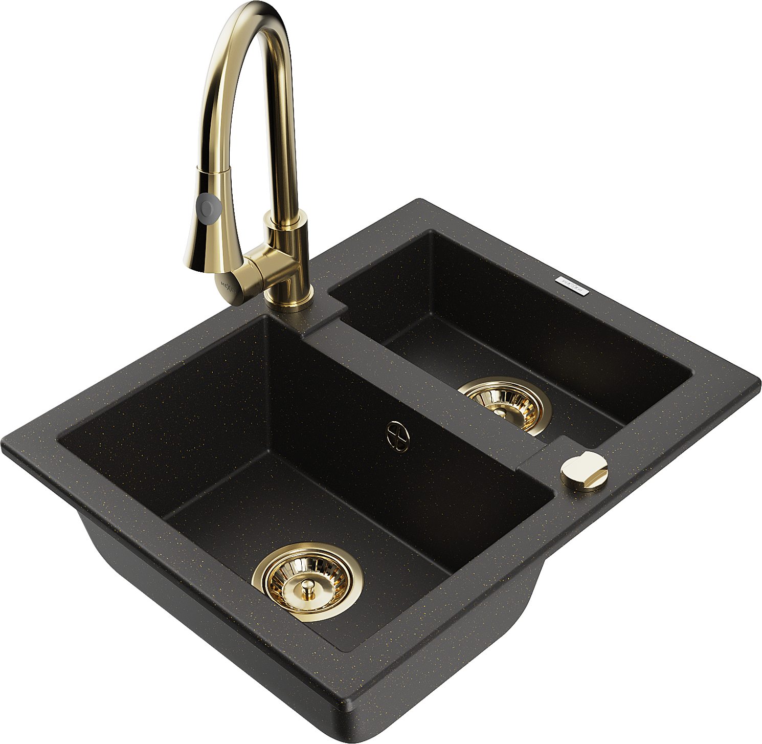Mexen Carlos 1.5-bowl granite sink with Elia kitchen tap, black/gold metallic - 6518-75-670101-50