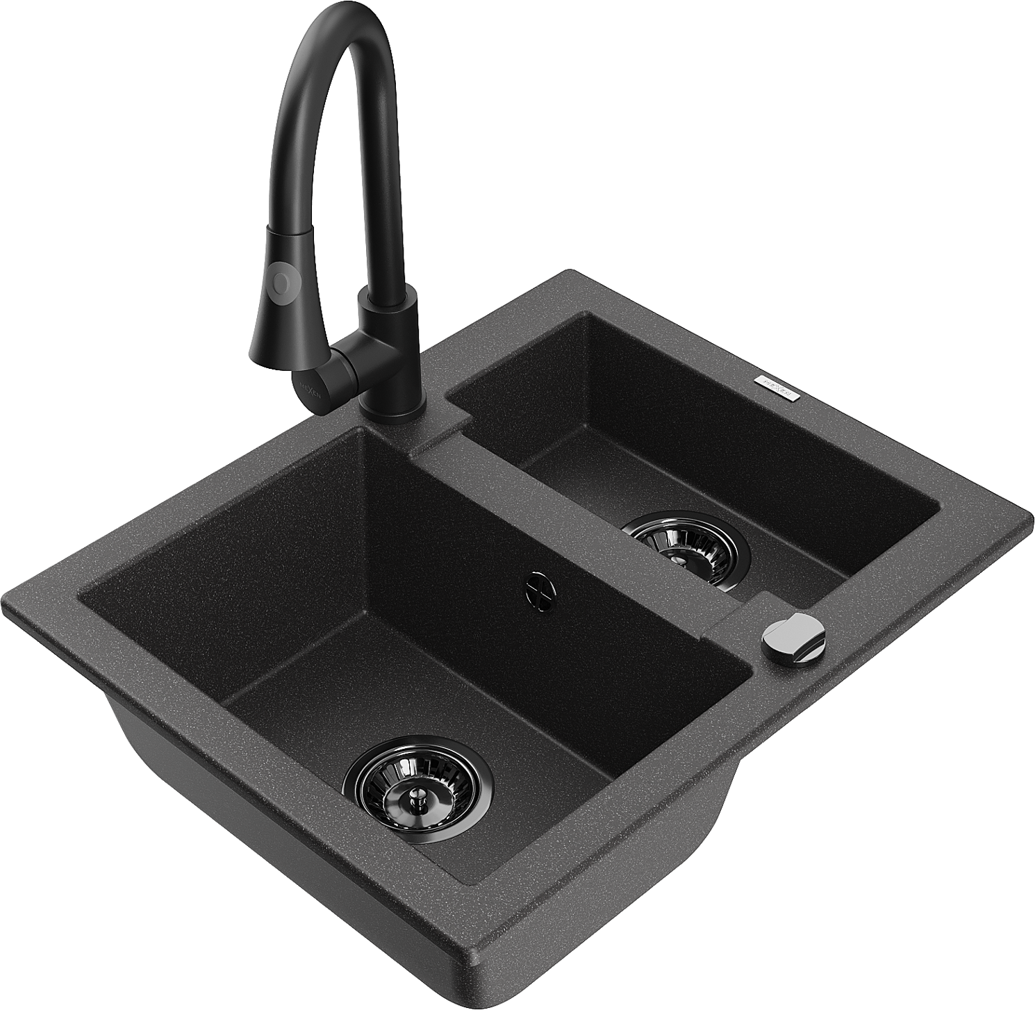 Mexen Carlos granite sink 1.5-bowl with Elia kitchen tap, black speckled - 6518-76-670101-70-B