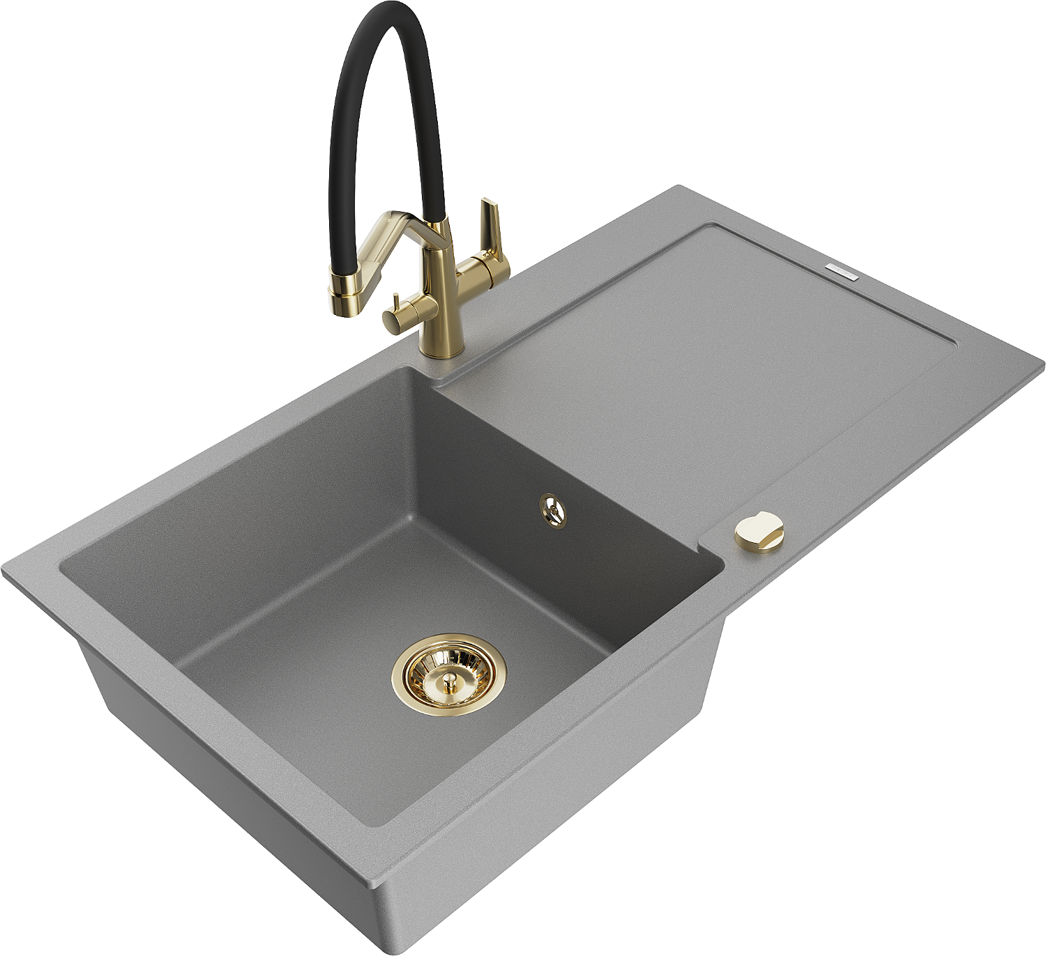 Mexen Leo granite kitchen sink 1-bowl with drainer and Duo kitchen tap, grey - 6501-71-671701-57-G