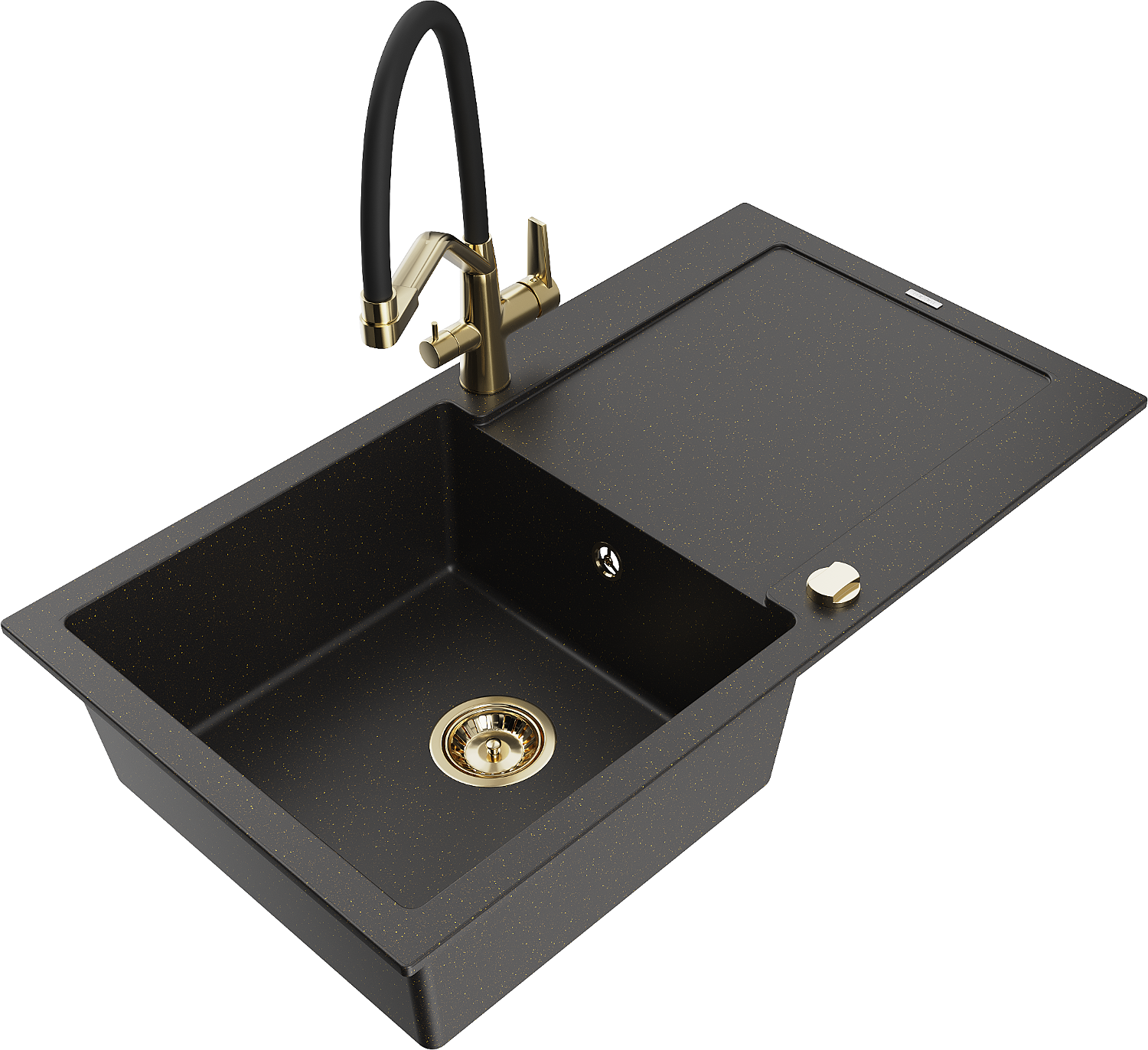 Mexen Leo granite kitchen sink, 1-bowl with drainer and Duo kitchen tap, black/gold metallic - 6501-75-671701-57-G