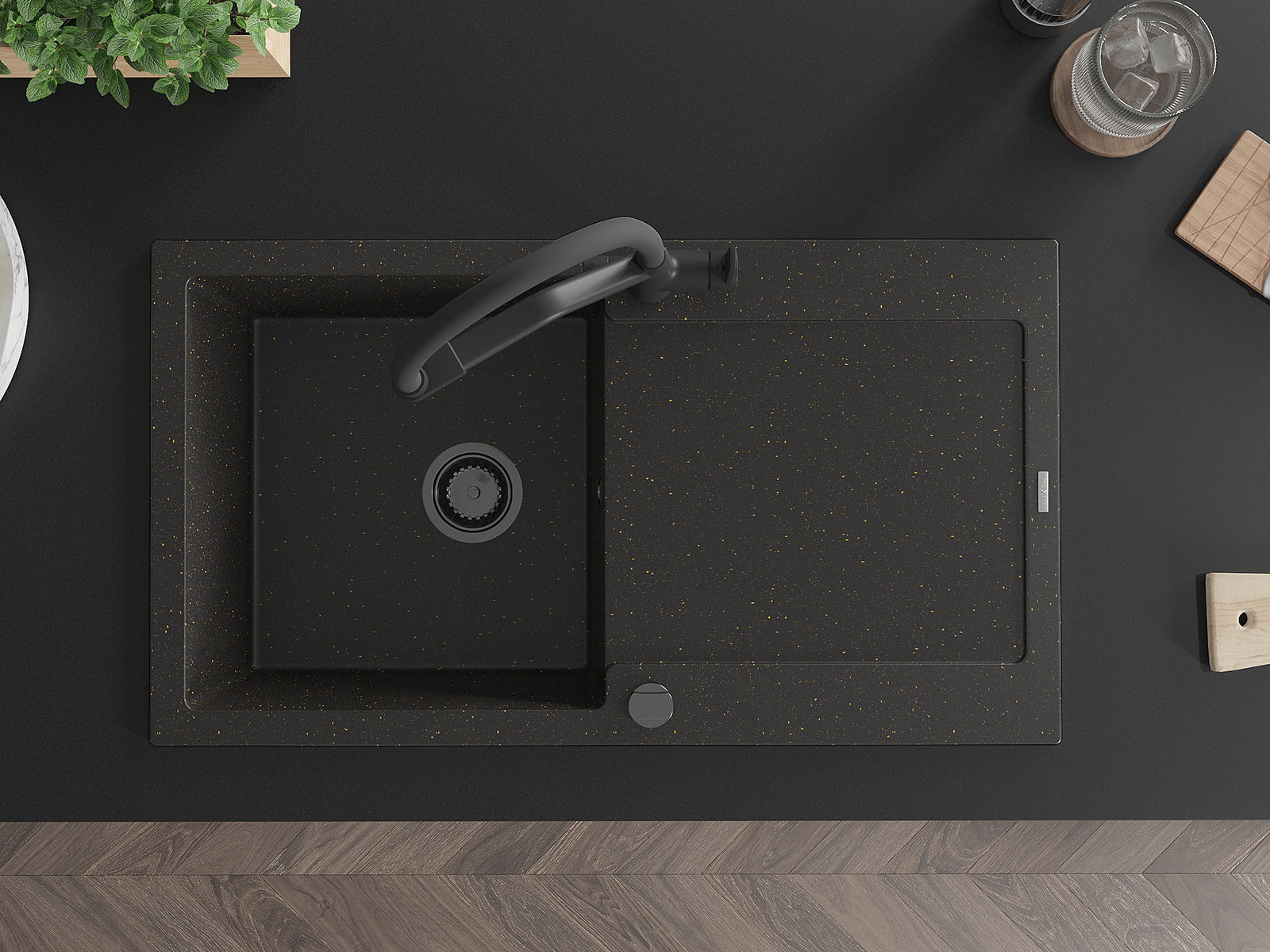 Mexen Leo 1-bowl granite kitchen sink with drainer and Duo tap, black/golden metallic - 6501-75-671701-70-B