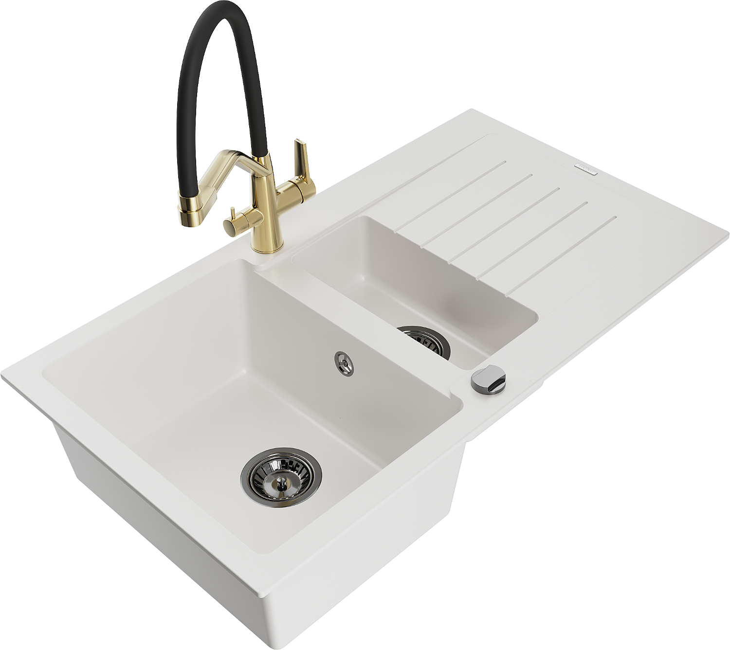 Mexen Matias granite sink 1.5-bowl with drainer and Duo kitchen tap, white - 6502-20-671701-57-B