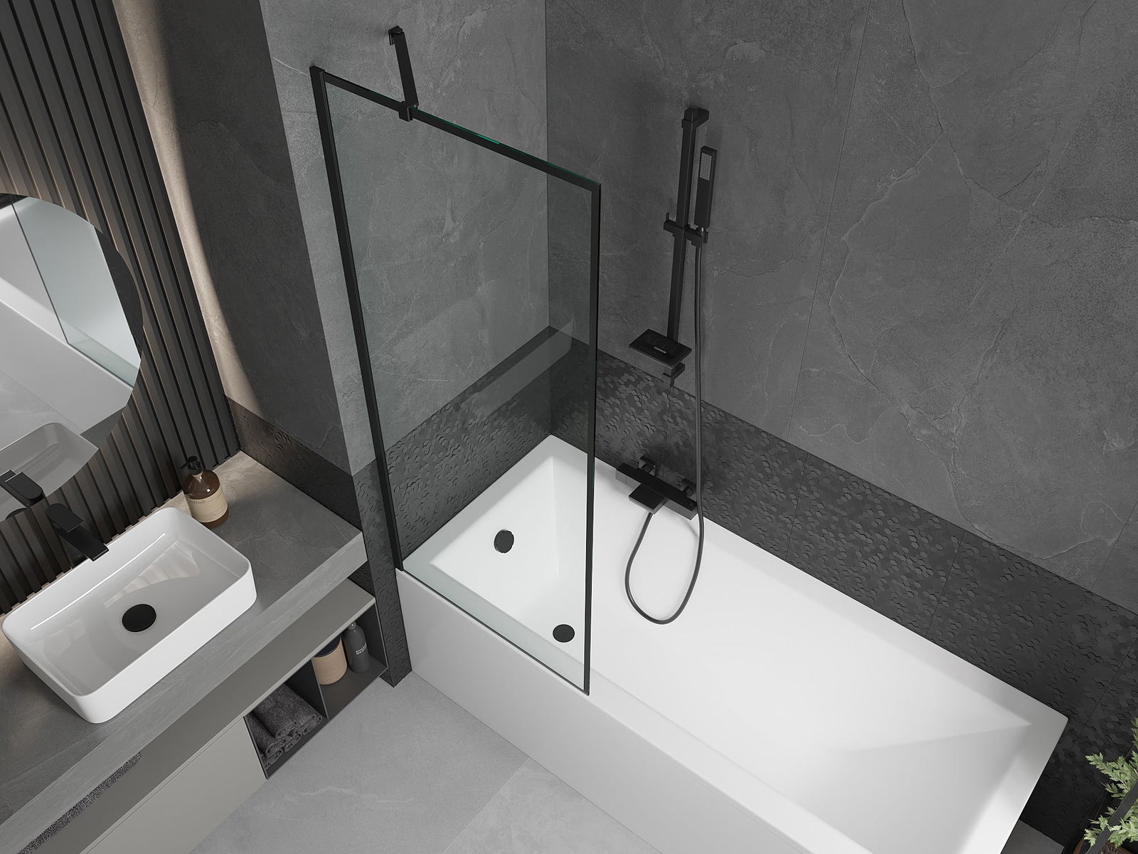 Effective protection against water spilling during bathing. The screen has seals that perfectly fit the glass surface and the edge of the bathtub. A functional solution ensuring safety and easy maintenance of cleanliness.