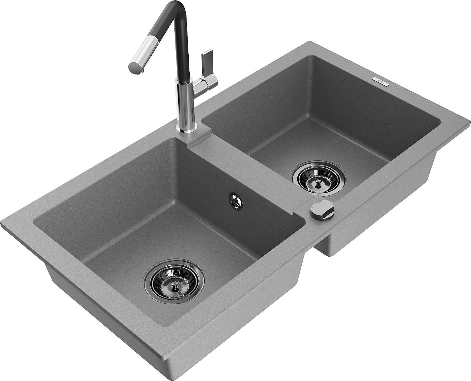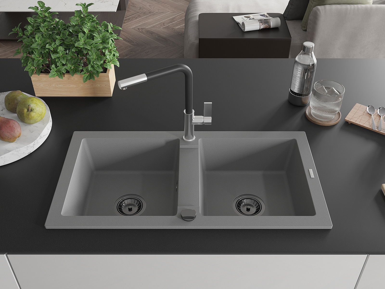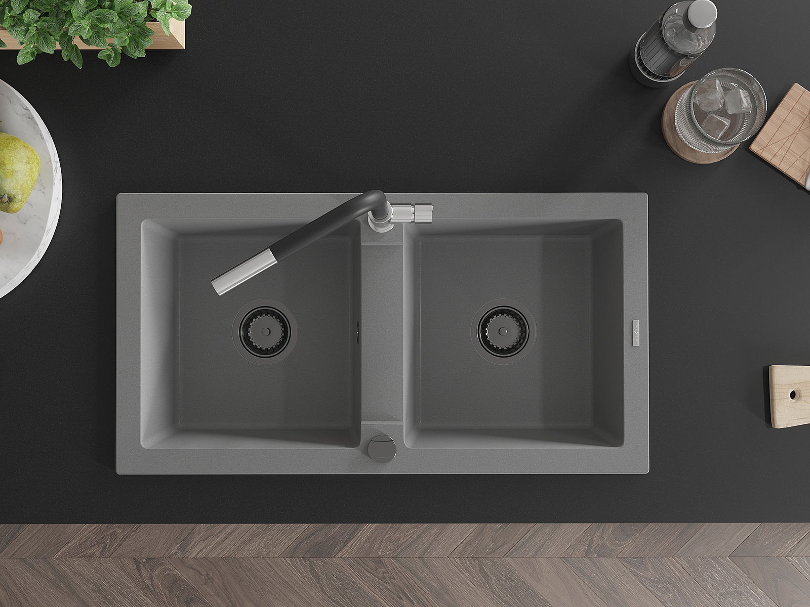 Mexen Mario granite kitchen sink 2-bowl with Flora kitchen tap, grey - 6504-71-670401-07-B