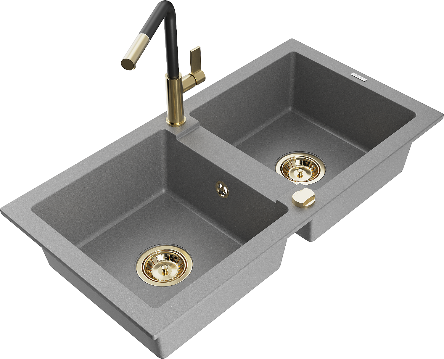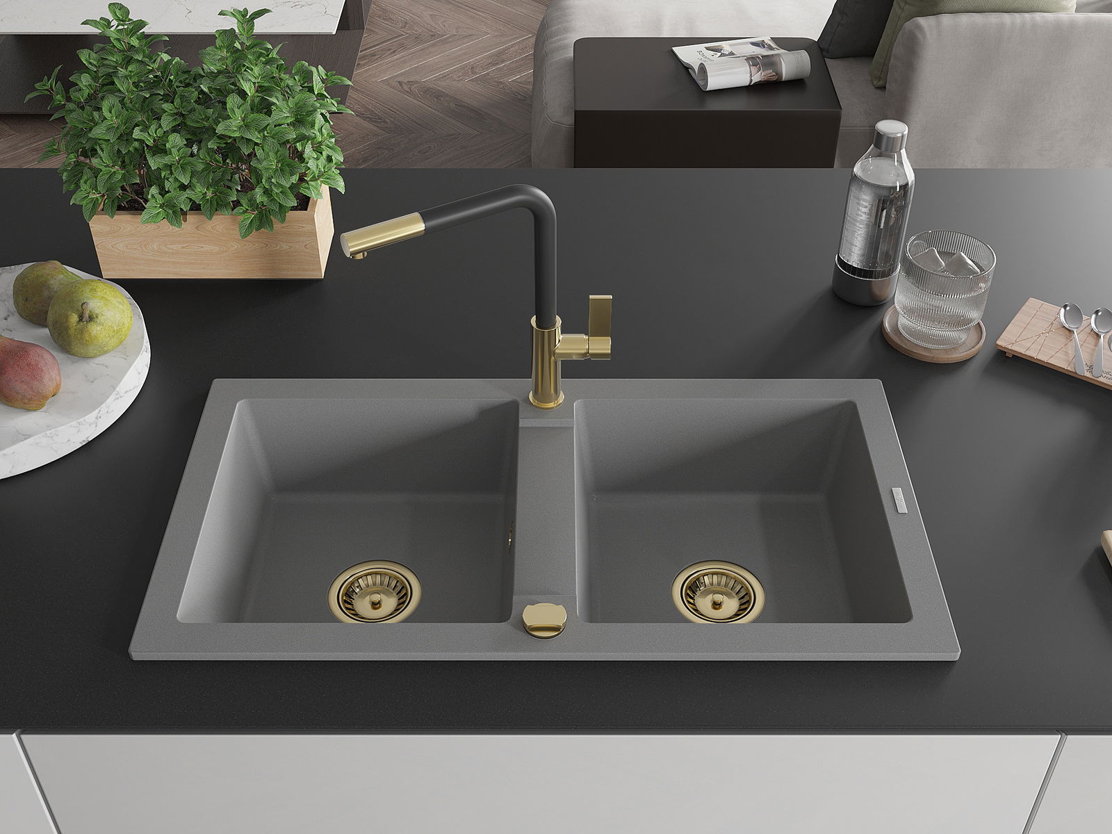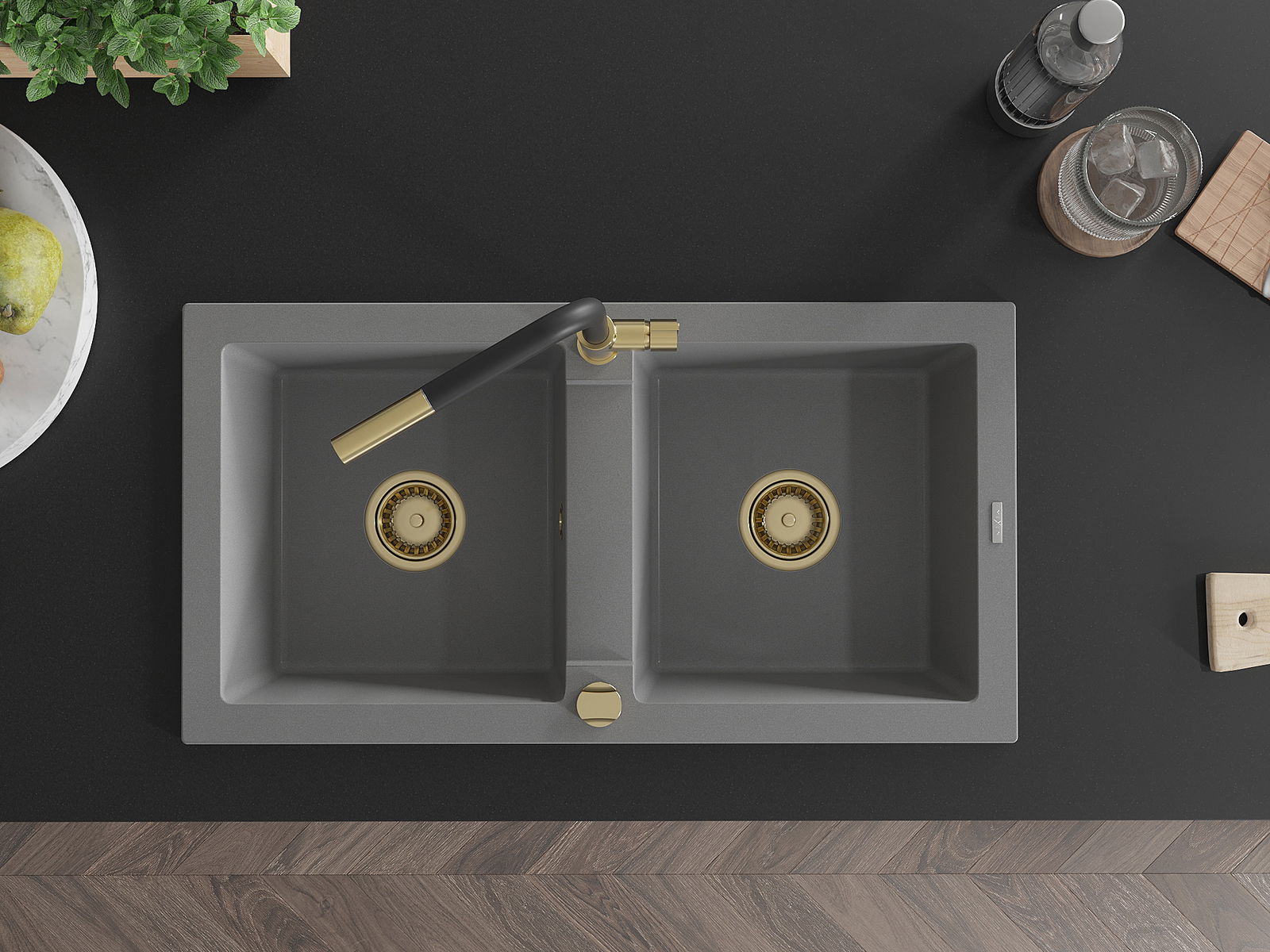 Mexen Mario granite sink 2-bowl with Flora kitchen tap, grey - 6504-71-670401-57-G