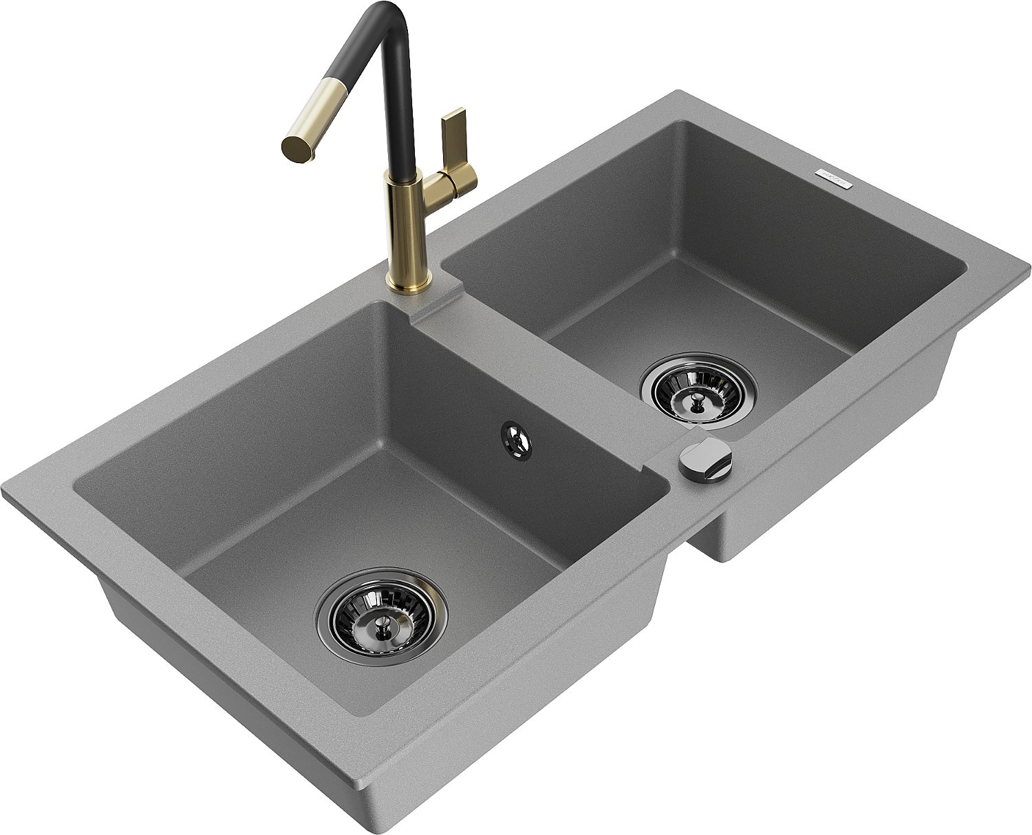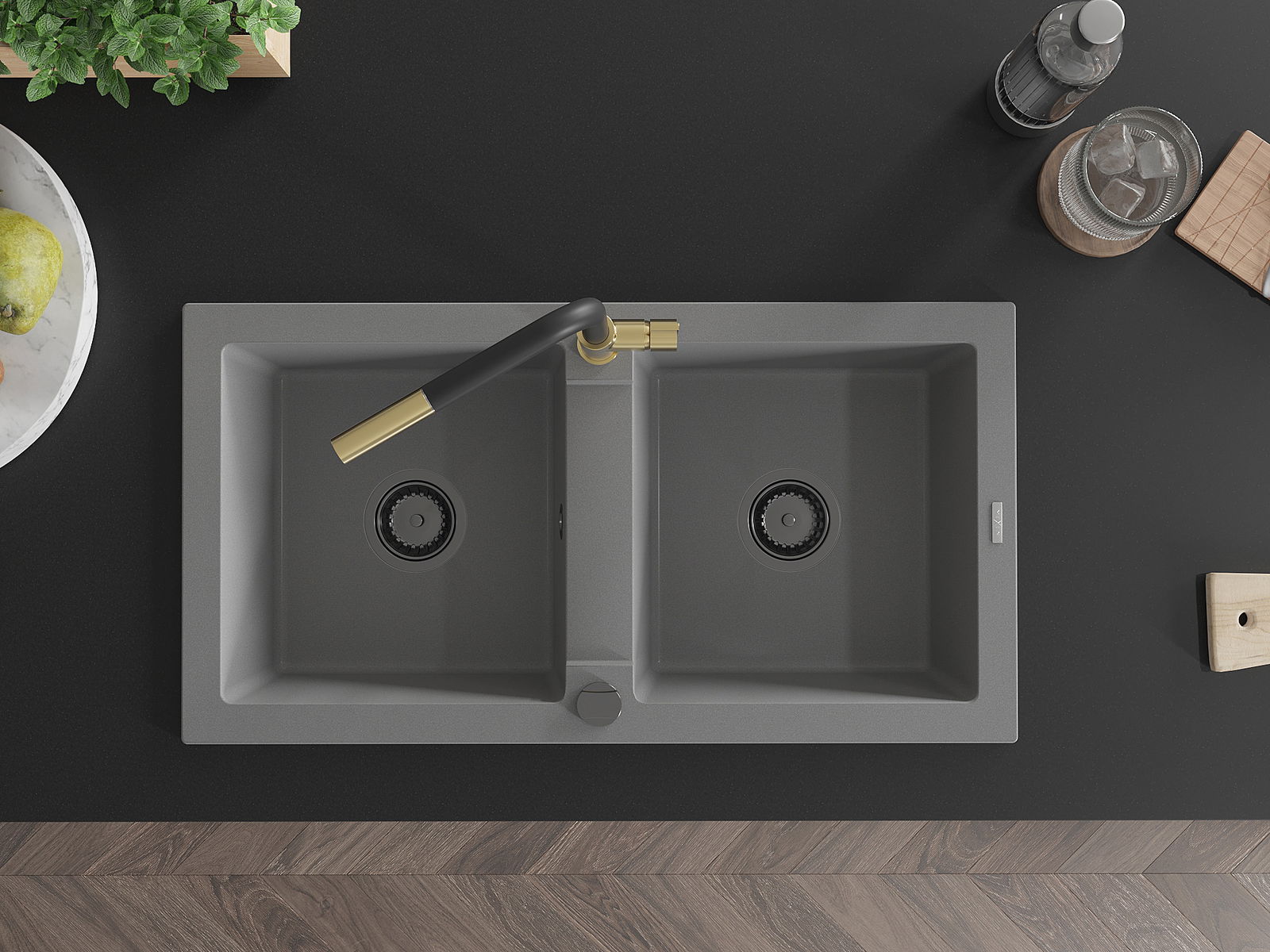 Mexen Mario 2-bowl granite sink with Flora kitchen tap, grey - 6504-71-670401-57-B